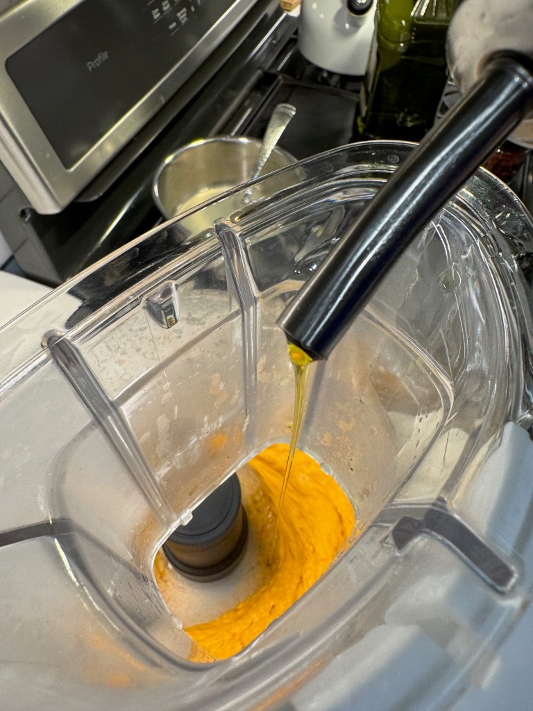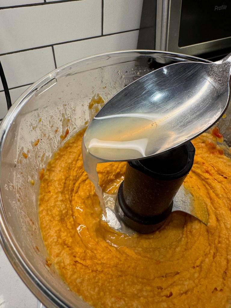 Use the large bowl of a food processor (or a good blender with the vent cover off) to combine the warm chickpeas plus a little bit of the liquid, half a roasted sweet potato, some tahini and salt. Pulse several times until you have a somewhat smooth mixture of hummus. This was my first shot at using harissa in hummus, so I gave it a quick sample test and found it to be a great pairing with the sweet potato! If you are not familiar with harissa, it’s a spicy chile pepper paste common to Morocco and other mideast cultures. It usually includes some variety of chiles, plus garlic and seed spices, such as caraway, coriander and cumin.