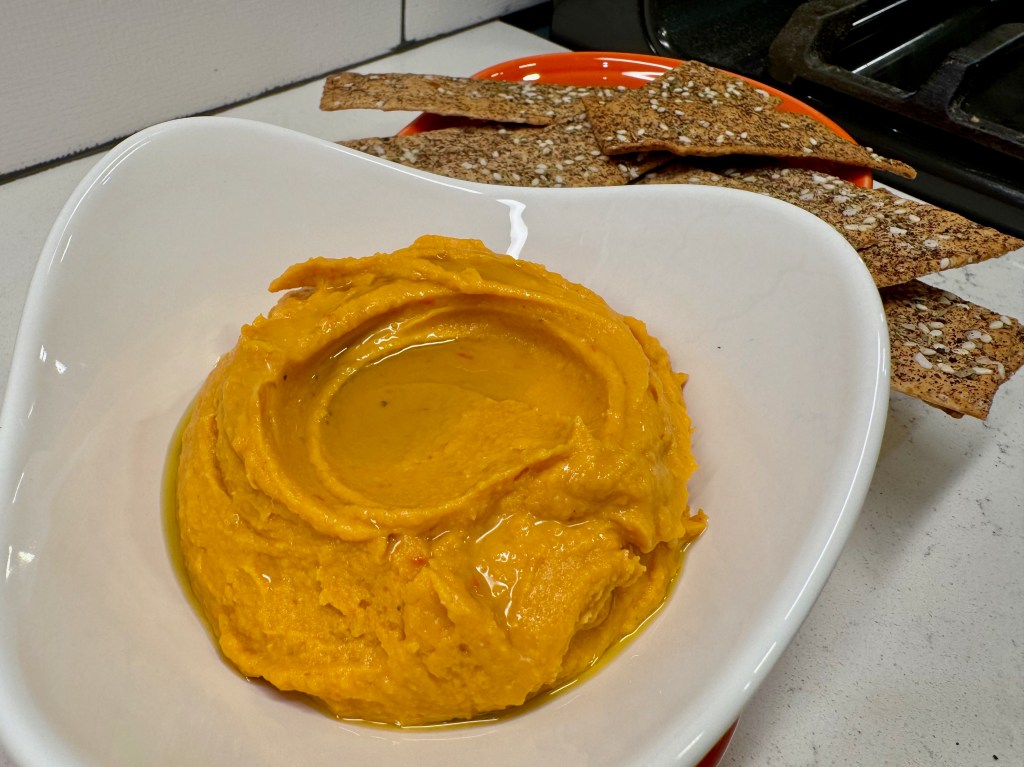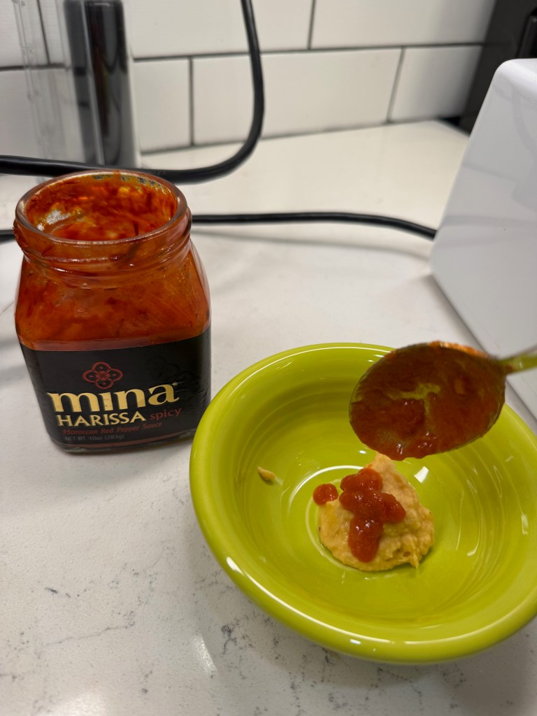 This brand of harissa is labeled “spicy,” but don’t you believe it. I barely tasted any heat at all and my husband said the same. If you are sensitive to capsaicin heat, be sure you evaluate the level in your harissa and use your judgment on how much can be added without it sending you to the ER. If your body can’t take capsaicin at all, simply omit it. The sweet potato hummus is delicious without further embellishment.