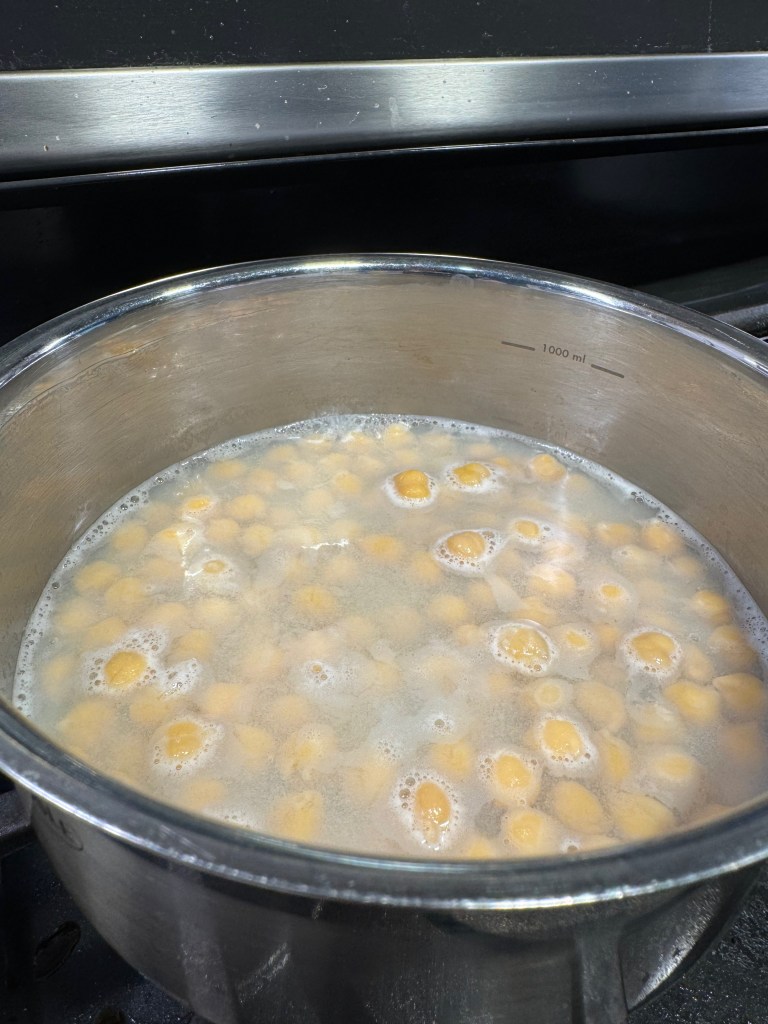 - Pour entire can of garbanzo beans (including the liquid) into a small saucepan over medium-low heat. Add baking soda and bring to simmer until you notice light boiling around the edges and steam rising from the pan. Remove from heat and strain the beans, reserving the liquid.
