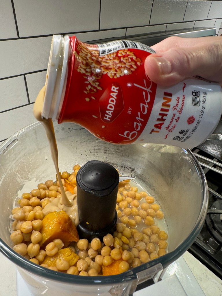 - Add beans, plus about 1/4 cup of the liquid, to the large bowl of a food processor or blender (with vent cover removed). Add sweet potato, tahini and salt to the processor and pulse several times until the mixture is blended but still slightly coarse. Use a spatula to scrape down the sides of the processor bowl.