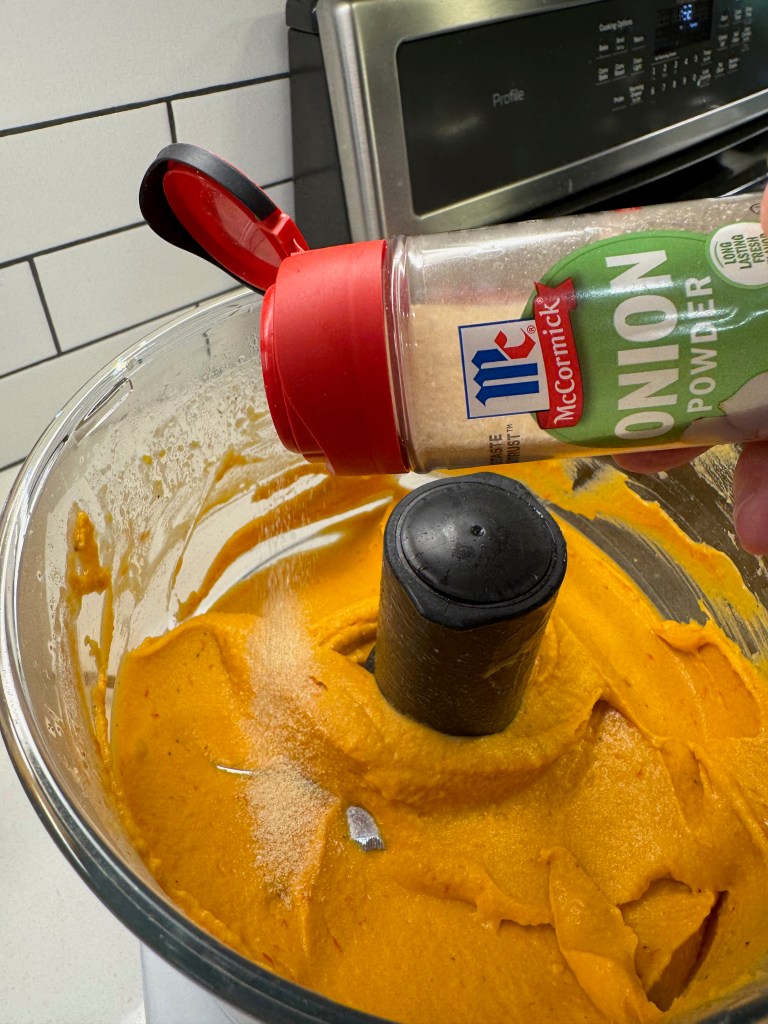- Run the processor consistently while you drizzle the olive oil into the chute. Give it a final taste test, adjusting as needed with onion powder, garlic powder, salt and/or pepper. This hummus is best after refrigerating for a few hours, and it will firm up a bit in the fridge.