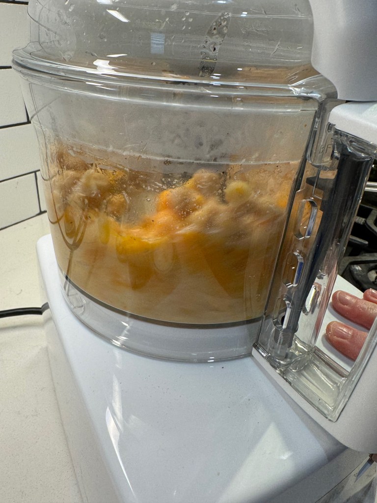 Gather up a few key ingredients, including: garbanzo beans, which I like to call “chickpeas;” tahini, which is a thin sesame seed paste; olive oil and some seasonings. You’ll need a food processor or a good strong blender to make it, though I would not recommend using a bullet-style blender. The mixture will be somewhat hot, so you need to vent the container you use to blend it. If you only have a bullet blender, let it cool before you get to that step (for safety sake).