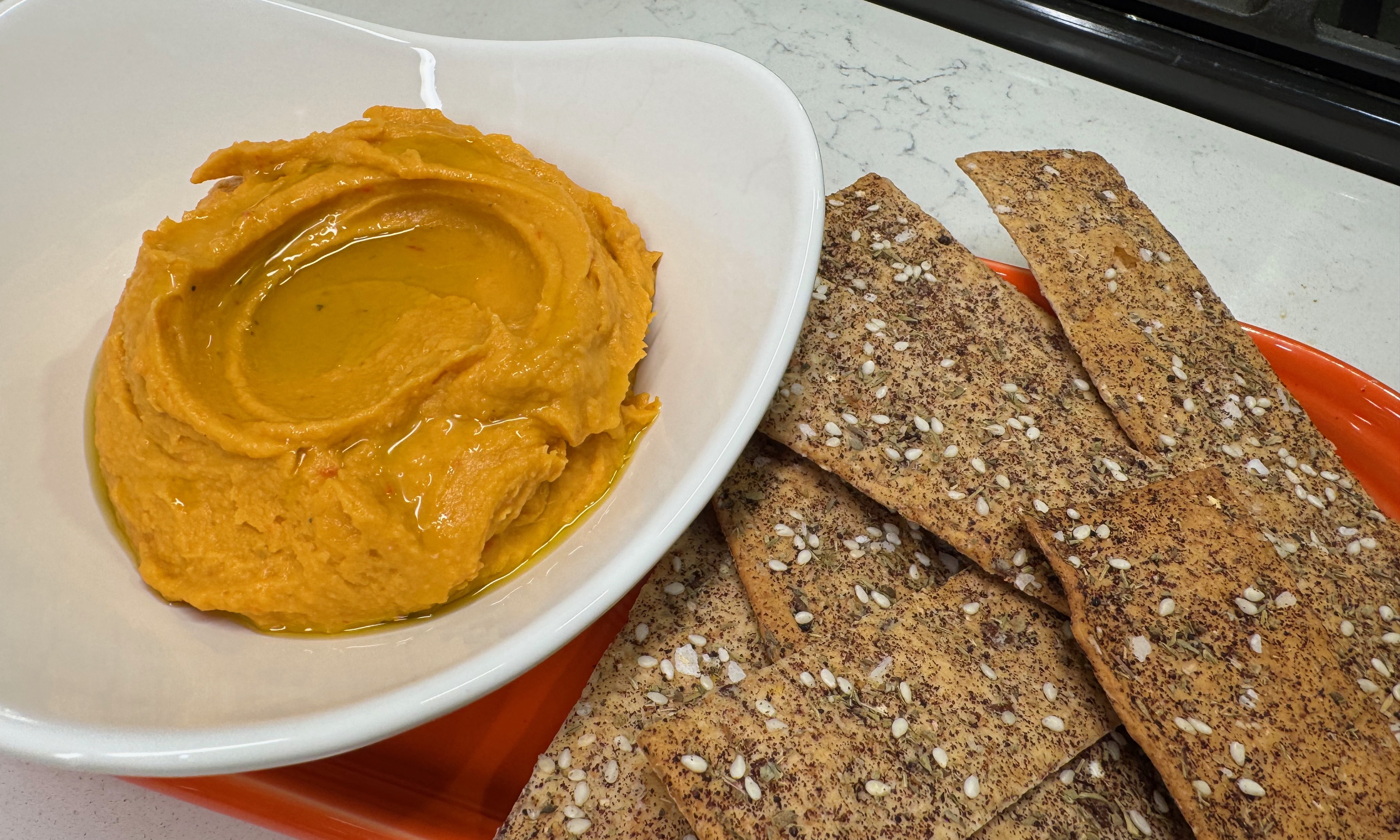 This is a fun, savory twist on classic hummus, using harissa paste from Morocco and seasonal sweet potatoes. Other beans may be substituted for chickpeas as noted.