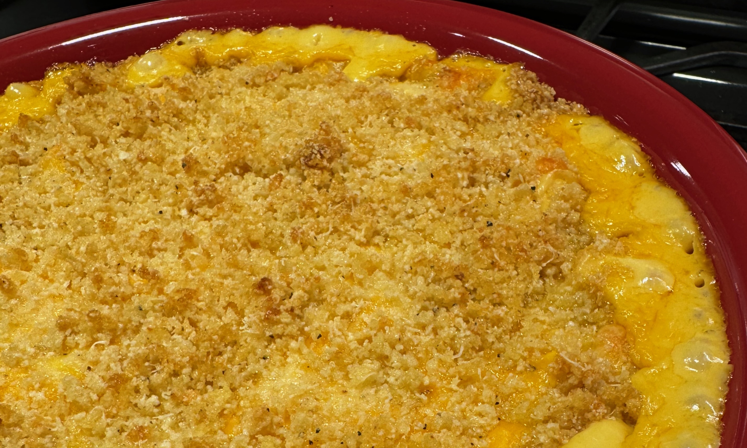 - Sprinkle the crumbs on top and bake until the cheese is ooey-gooey and bubbly and the crumbs are crispy crunchy toasty. Because in my kitchen, it’s all about texture!