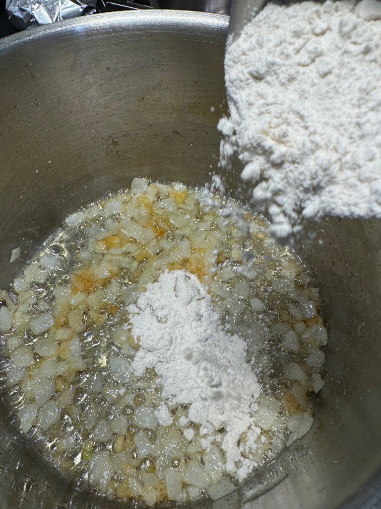- Melt butter over medium heat in a small stockpot. Add diced onion and salt and cook until the onions are tender and translucent, but not brown. Sprinkle in flour and cook, stirring constantly, until the roux is bubbly and golden in color. Pour in half of the milk and whisk until smooth and thickened; repeat with the rest of the milk.