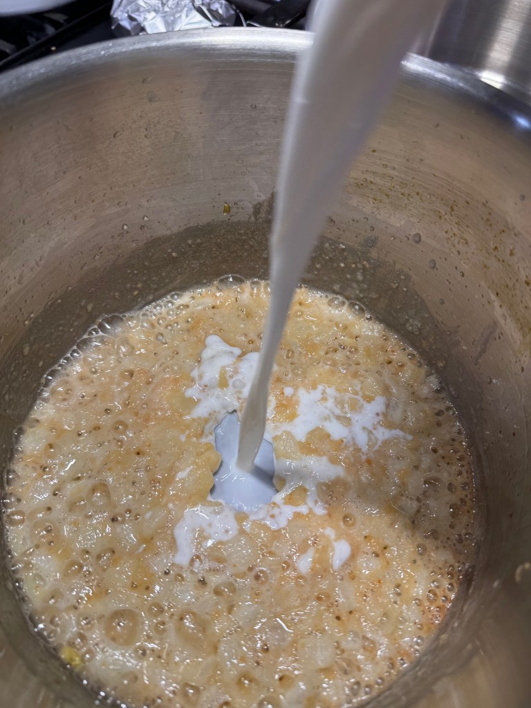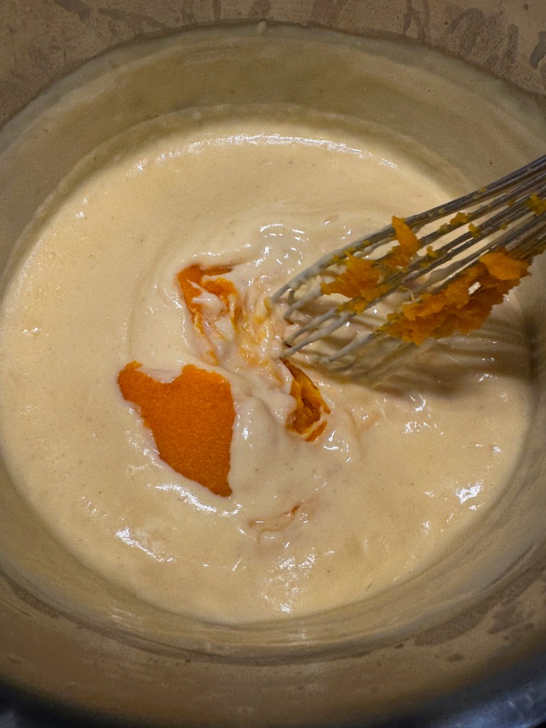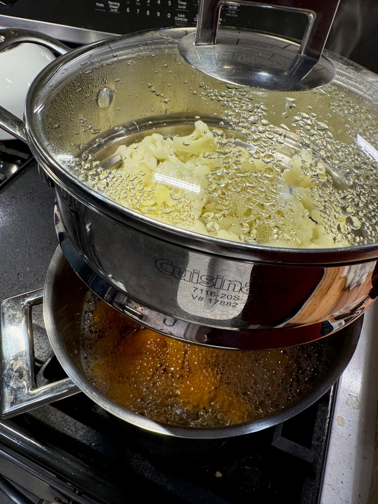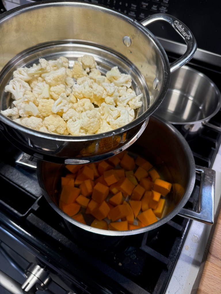 Both the squash and cauliflower will be pureed, so I needed to cook them to full tenderness ahead of making the dish. My steamer insert doesn’t get much action, but it earned its keep this time, as I boiled the squash cubes and simultaneously steamed the cauli in the insert. Three cheers for only needing one burner! This took about 25 minutes. I pressed the squash through a mesh strainer and then blotted away excess moisture with paper towels. The cauli only needed to cool.