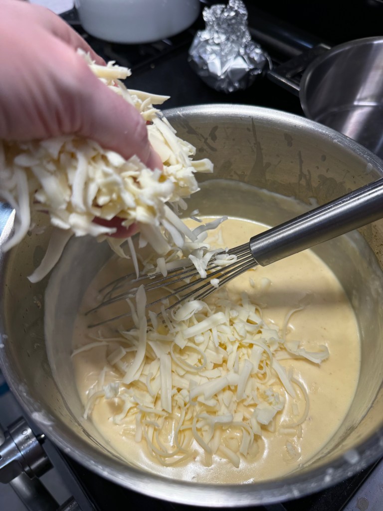 The cheese came next, beginning with a few ounces of American processed cheese. I know, I know, some say that this isn’t “real” cheese. But as Kenji López-Alt, one of my culinary idols, has said, it’s like saying that meatloaf isn’t meat. American cheese is just cheese that has been chemically adjusted with certain salts and stabilizers that prevent fat separation when you melt it. Using a little bit in my cheese sauce sets the stage for the other cheeses to remain more stable. In other words, it keeps my cheese sauce more creamy than gloppy! The other cheeses I used were gruyere, which I love for its nutty flavor, and sharp white cheddar.