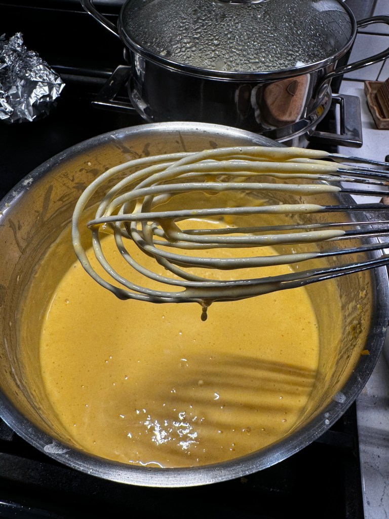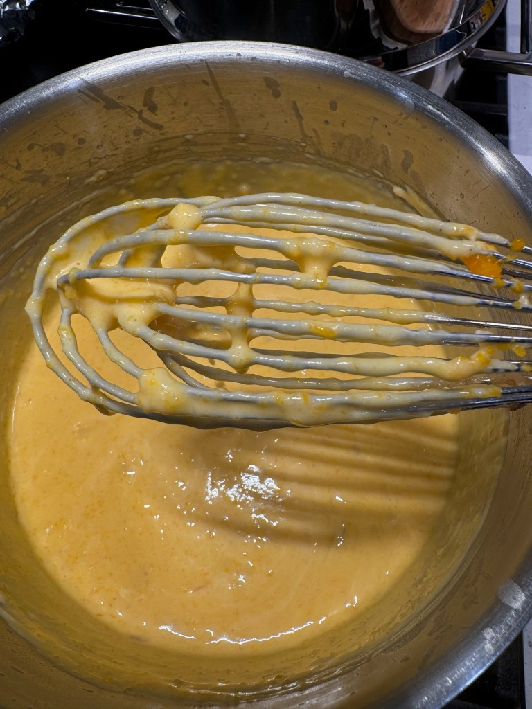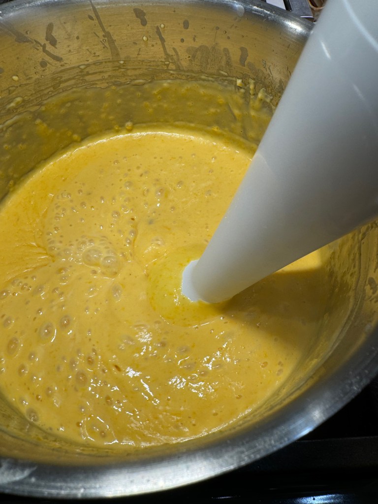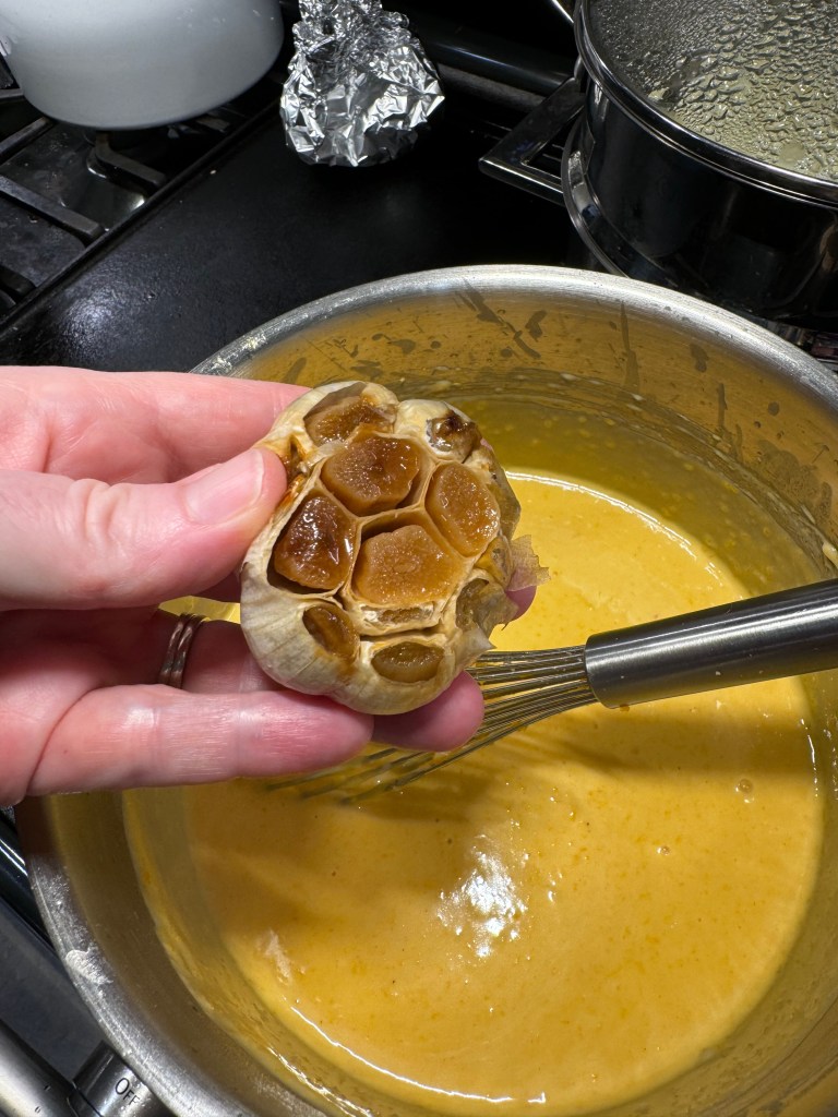 Do you see my secret weapon there? Roasted garlic adds incredible depth of flavor to a cheese sauce, and I squeezed out the entire thing into this one, plus the squash puree and (though I missed getting a picture of it) the tender steamed cauliflower. After whisking it all together, you can see that my sauce looks a little broken, but my immersion blender takes care of that!