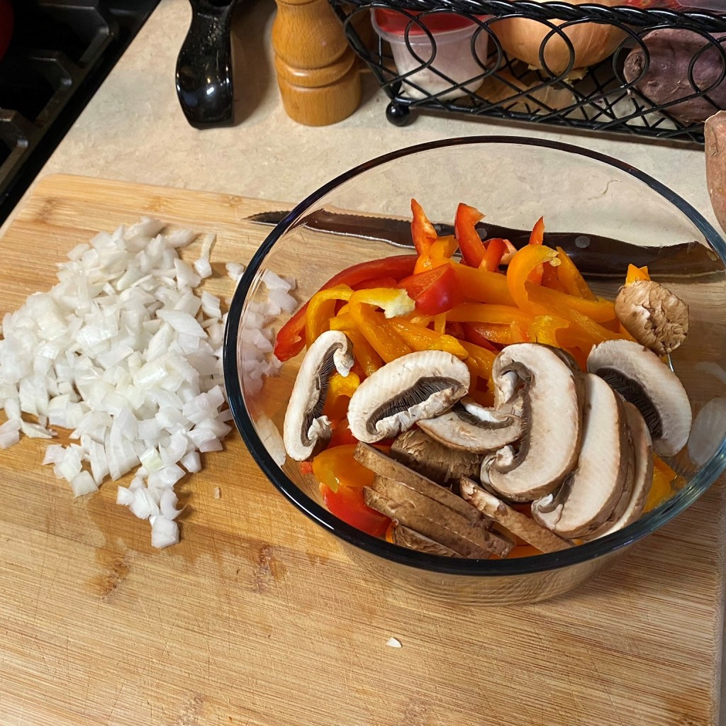 I like to have large chunks of pepper and onion in my chili. They hit the slow cooker next for a quick saute.