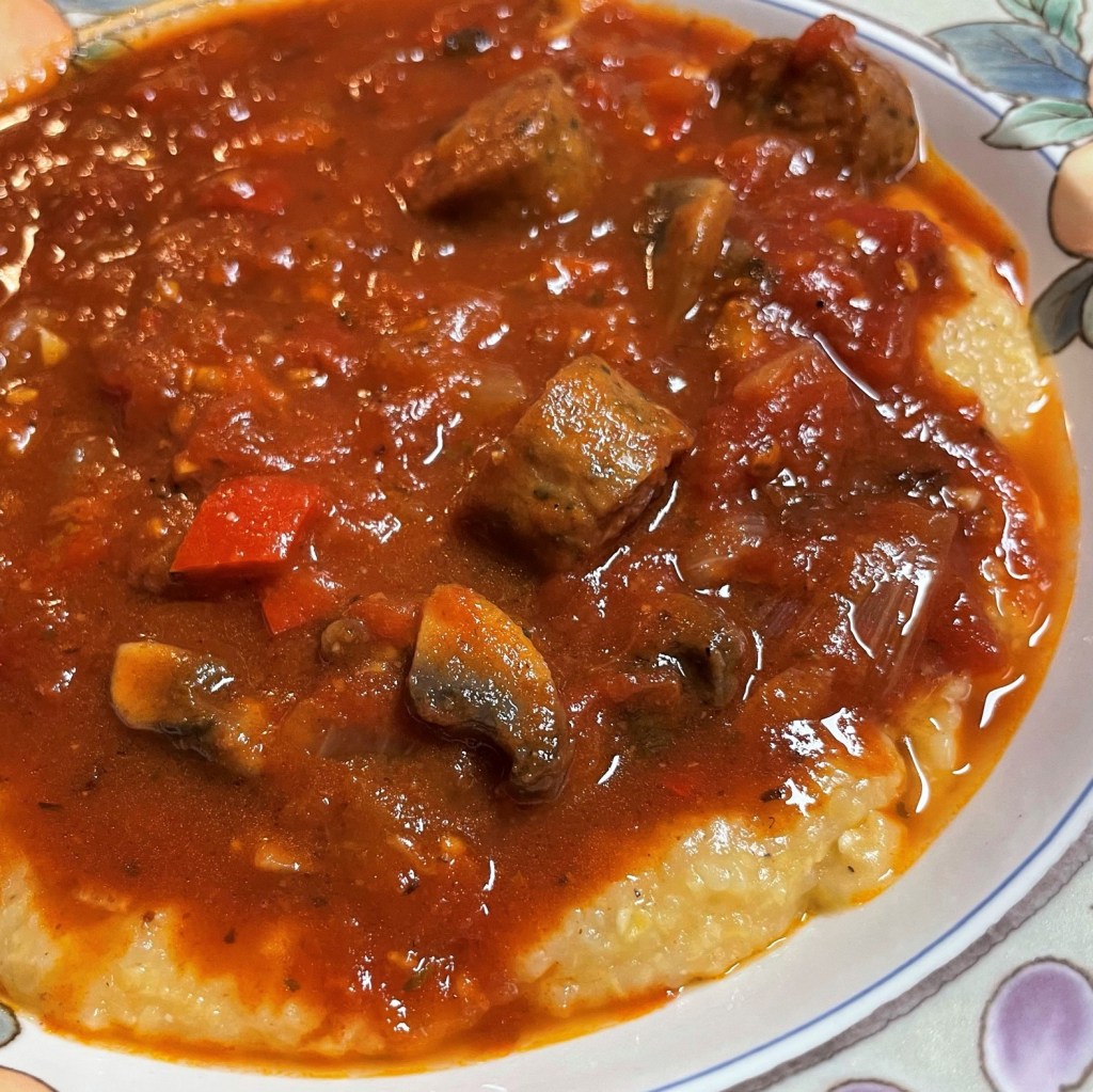 I’m not going to bore you all with the details. Suffice to say, while I roasted a bulb of garlic in the toaster oven, I diced up peppers and onions and lined up the other key ingredients (Guinness Foreign Extra Stout was the beer). I browned the bison in the slow cooker and flavored it with a taco skillet sauce, then removed the bison to sauté the vegetables. Eventually, everything went back into the slow cooker and I left it on low for 2½ hours. With the jalapeno pepper flakes and ground chipotle that I added, this chili came out, to quote Jim Carrey in Masked, “ssssmokin!”