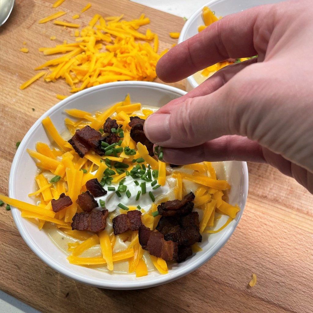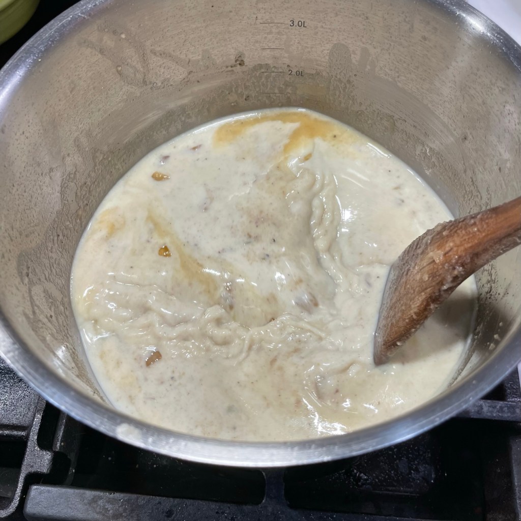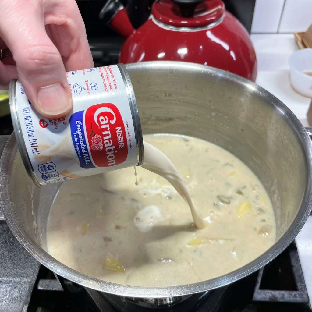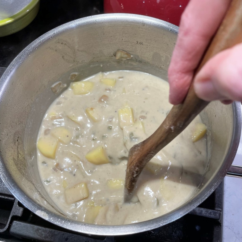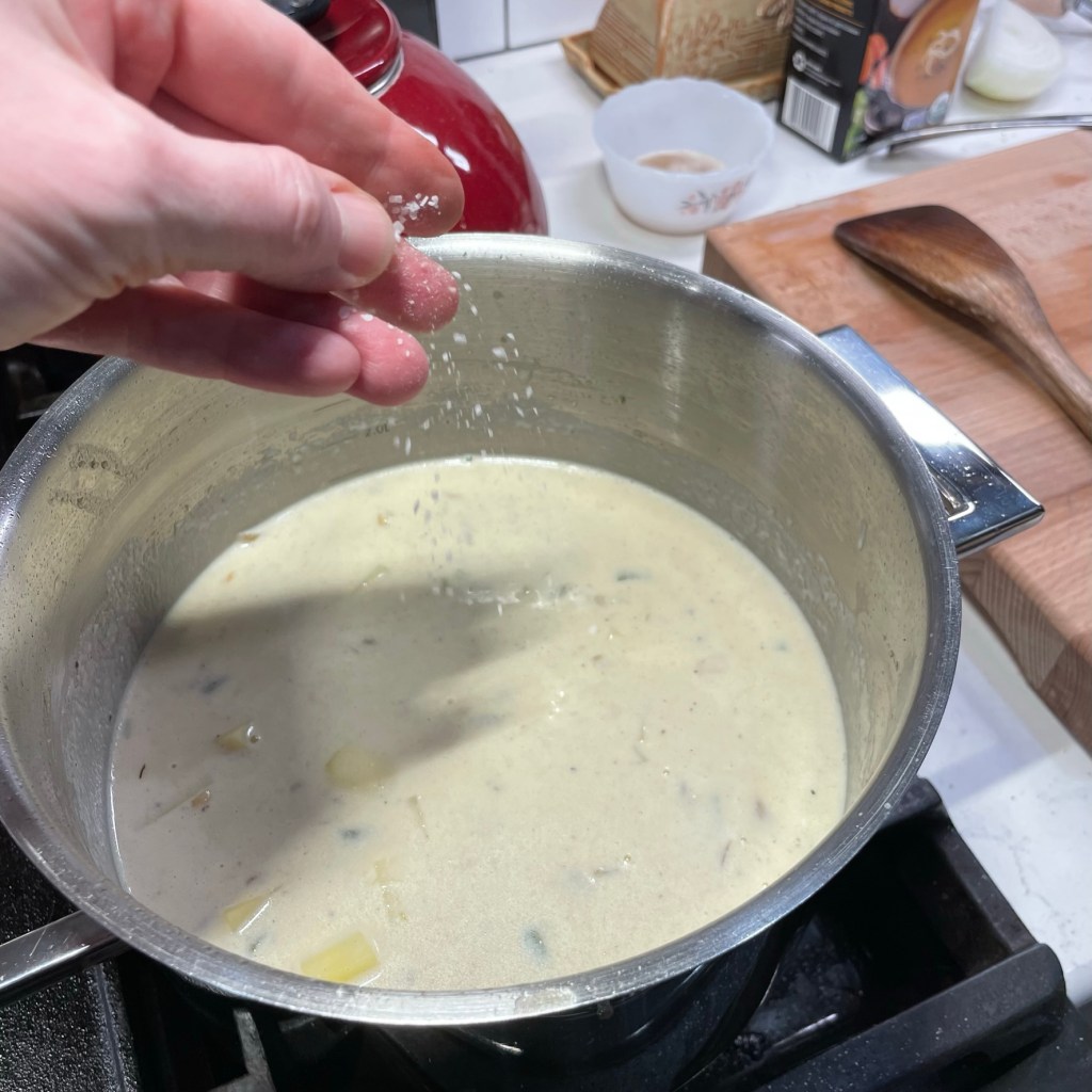 Here comes the big shortcut I took with this recipe. The Southern Living article said that only fresh whole clams were appropriate for this chowder—not chopped— and it included steps for purging the grit and then cooking the clams separately. I’m sure that canned chopped clams would come up short here, but the fresh chopped clams from my favorite local seafood chop were sweet, slightly chewy and so fresh; I’d put them up against the fussy whole-clam process any day of the week. These sweet little gems and their liquid get stirred in just at the end, along with the crisped-up bacon that started this whole thing.