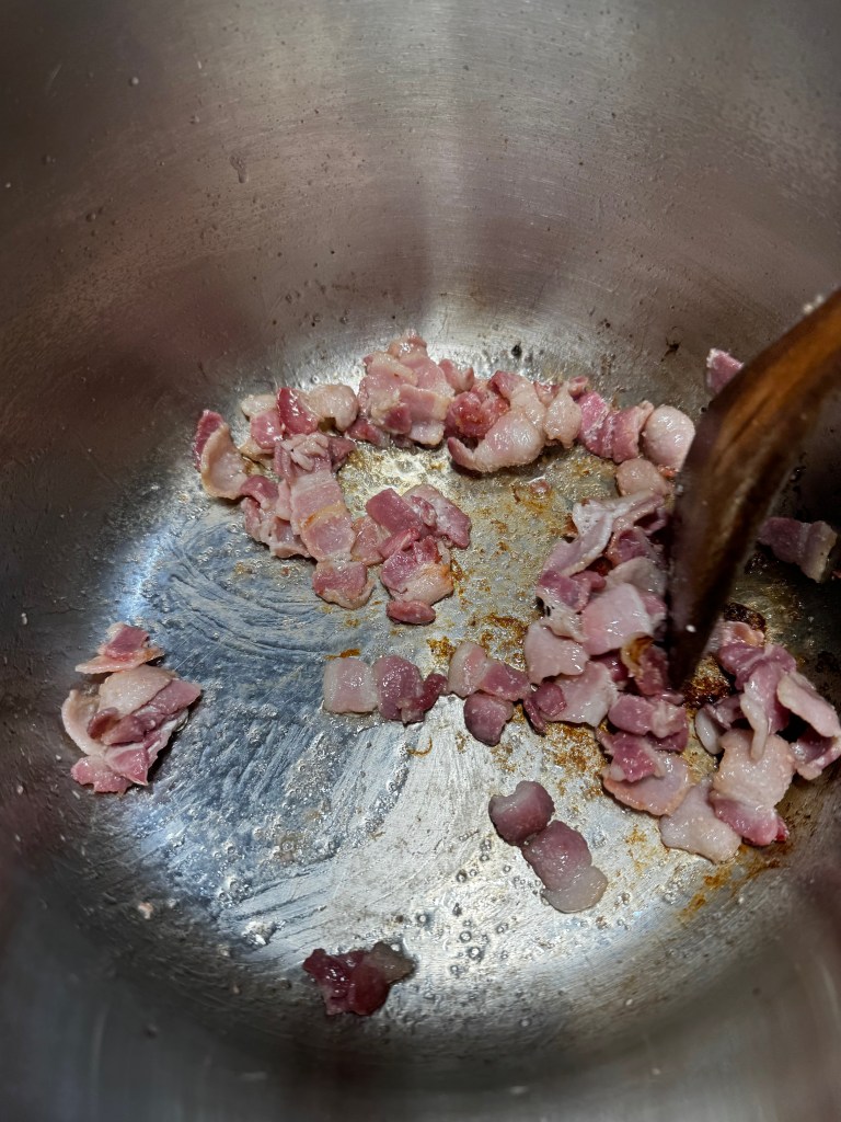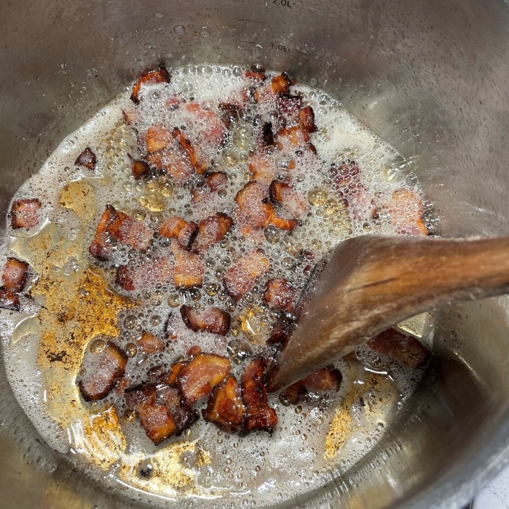 - In a heavy-bottomed pot, cook bacon over medium heat until crispy and then remove to a separate bowl.