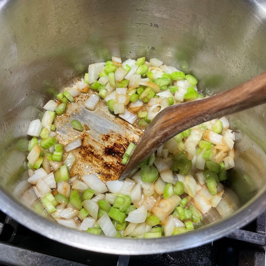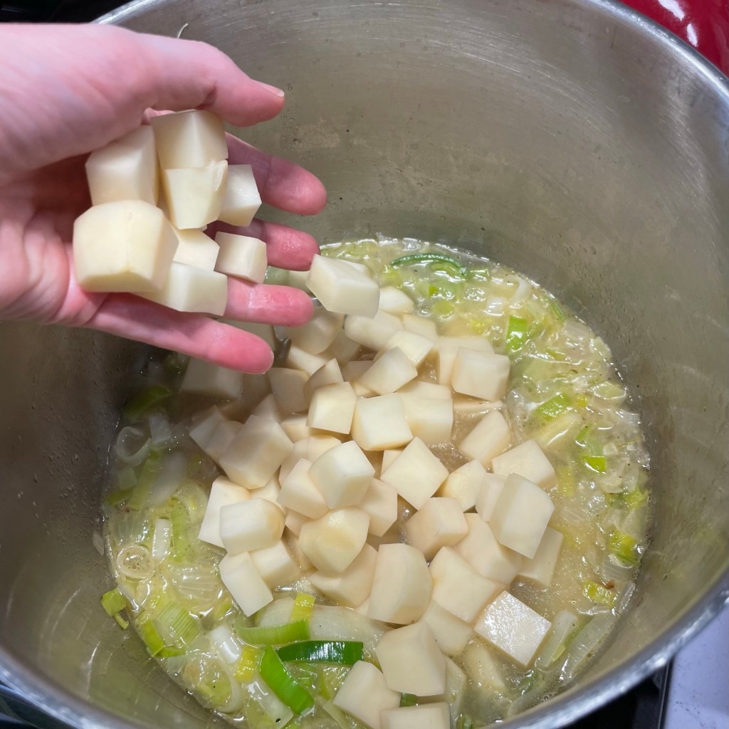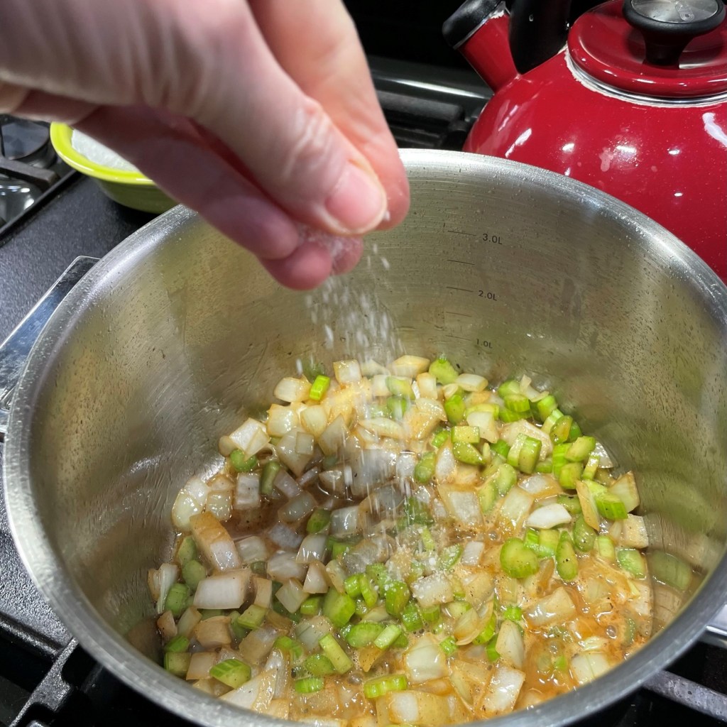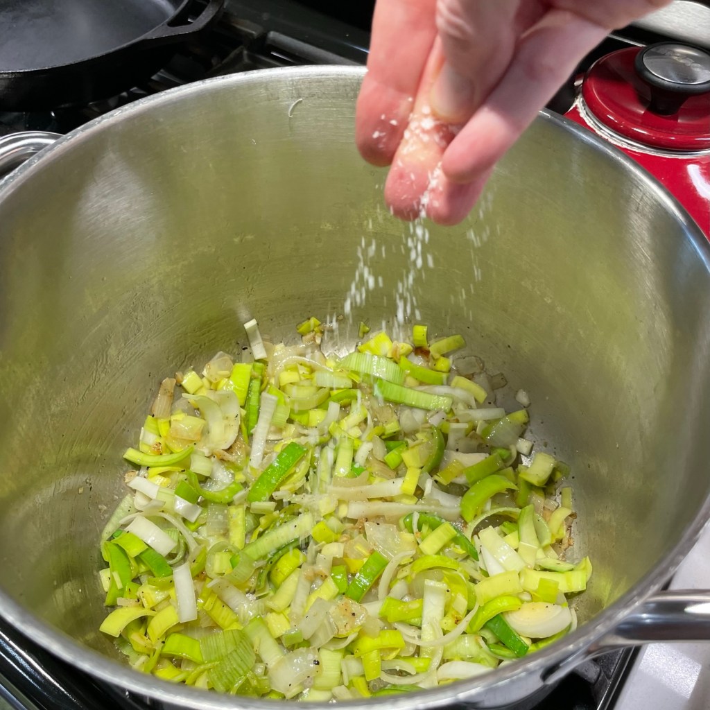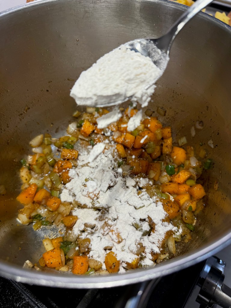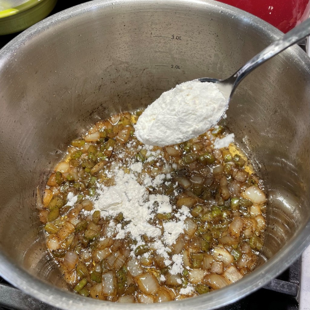 I didn’t have carrots on hand, but butternut squash stood in nicely. A jalapeño in the produce drawer promised to add a subtle layer of heat, which Les would never argue against. I sautéed those in the fat rendered from the bacon. To add a little extra body to the chowder, I cooked in a bit of flour just before deglazing the pot with white vermouth (because I never have wine on hand anymore).
