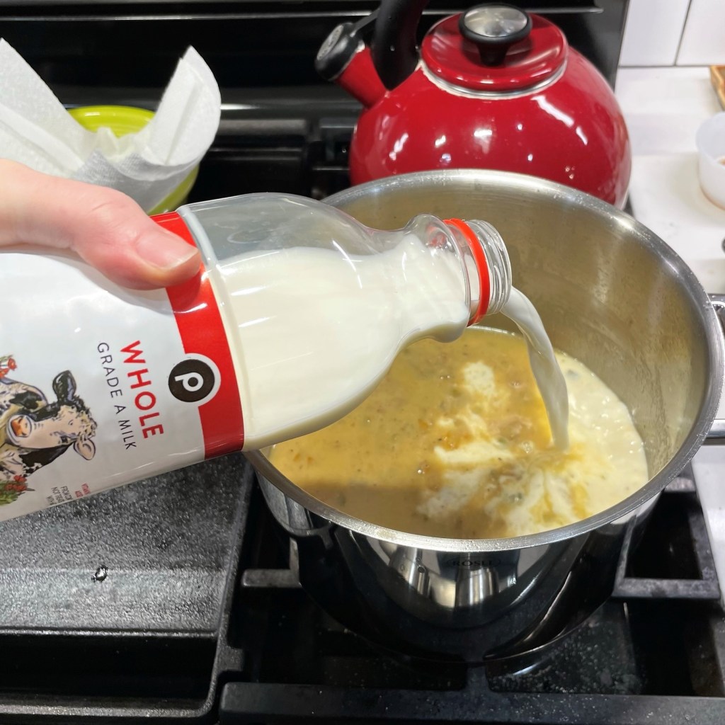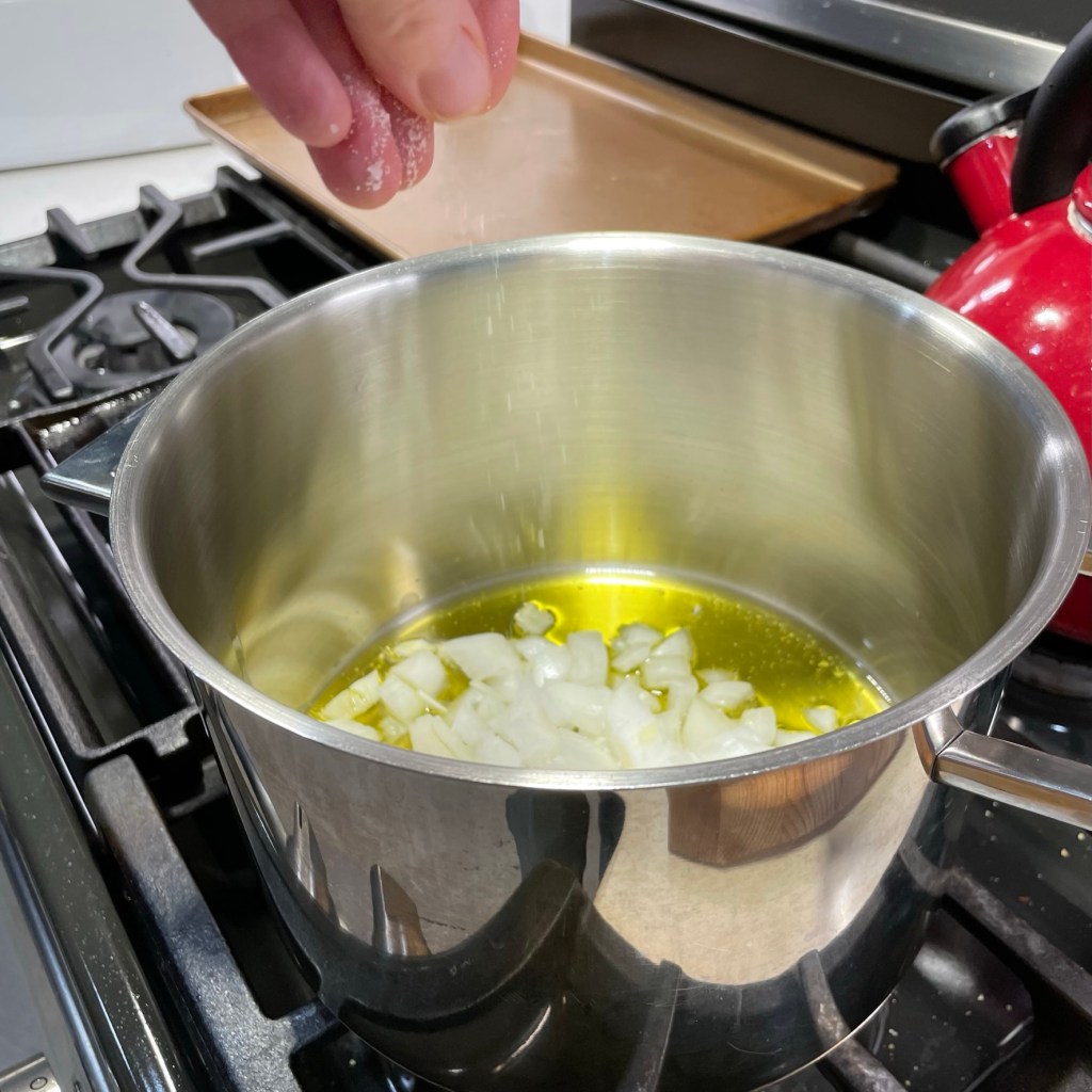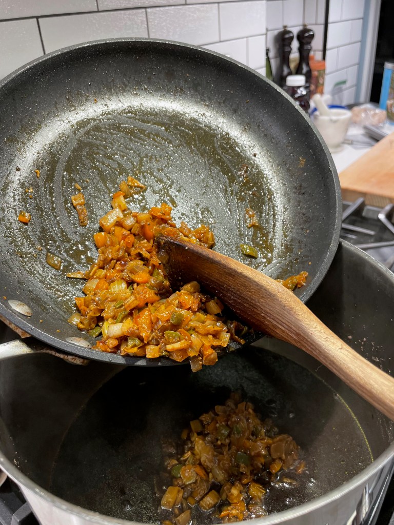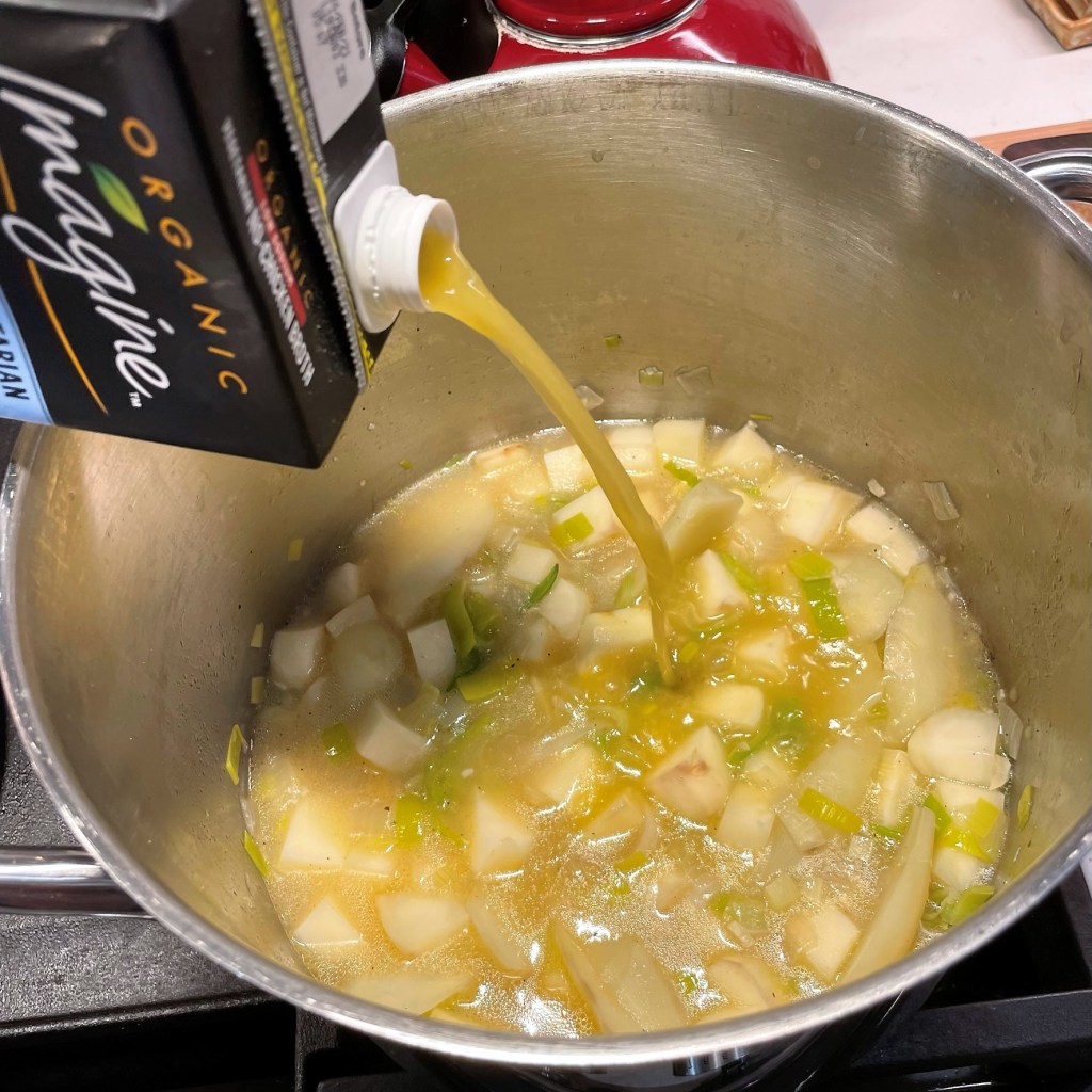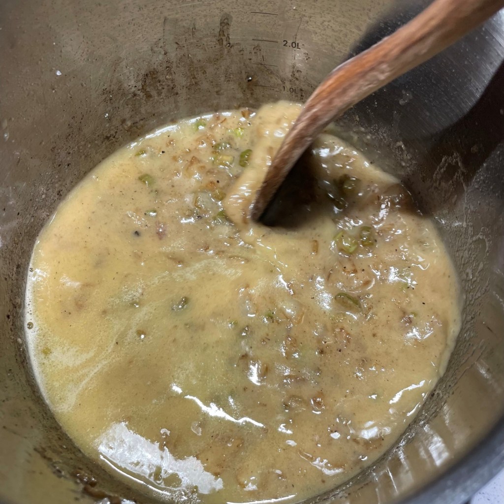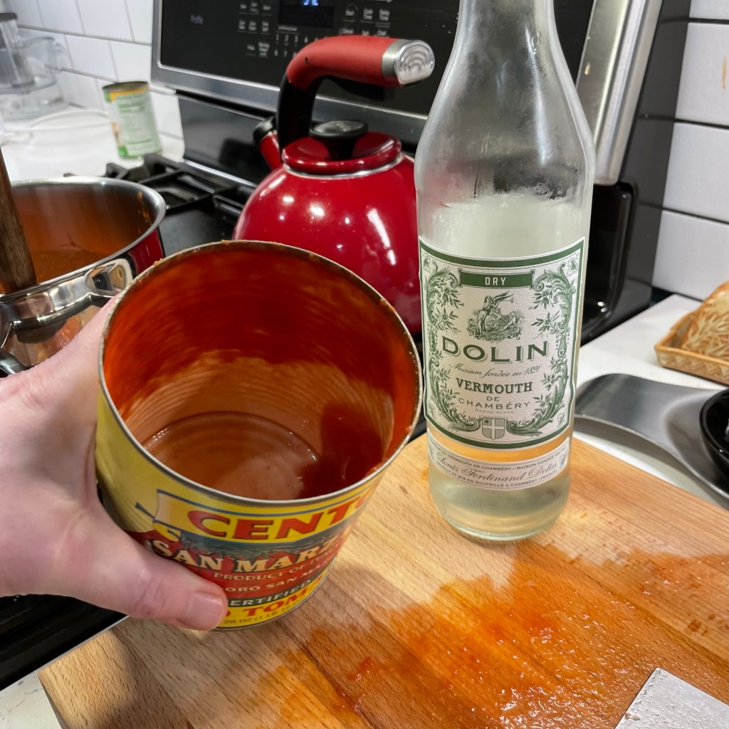 I didn’t have carrots on hand, but butternut squash stood in nicely. A jalapeño in the produce drawer promised to add a subtle layer of heat, which Les would never argue against. I sautéed those in the fat rendered from the bacon. To add a little extra body to the chowder, I cooked in a bit of flour just before deglazing the pot with white vermouth (because I never have wine on hand anymore).