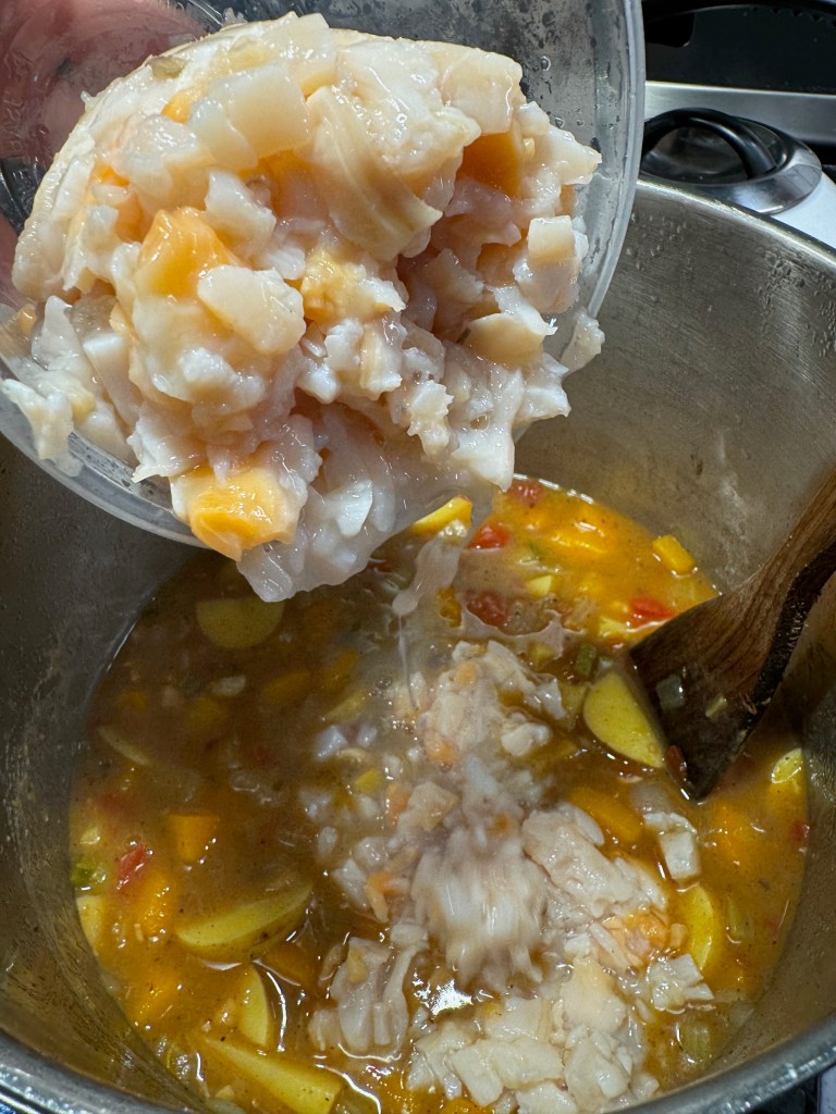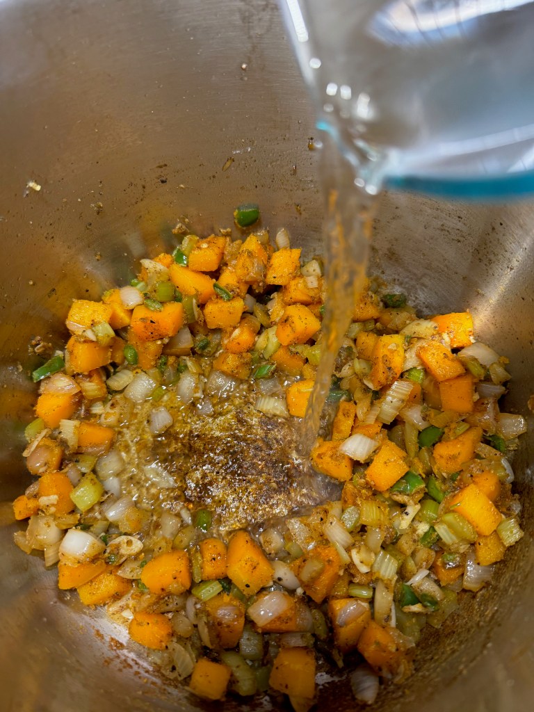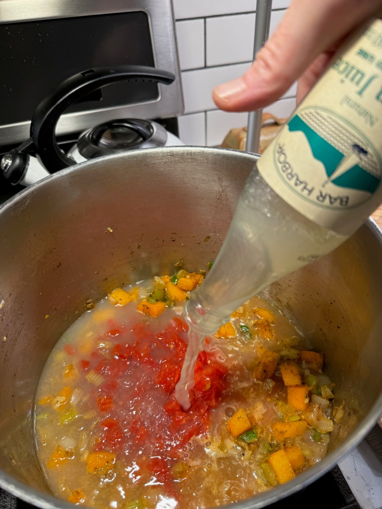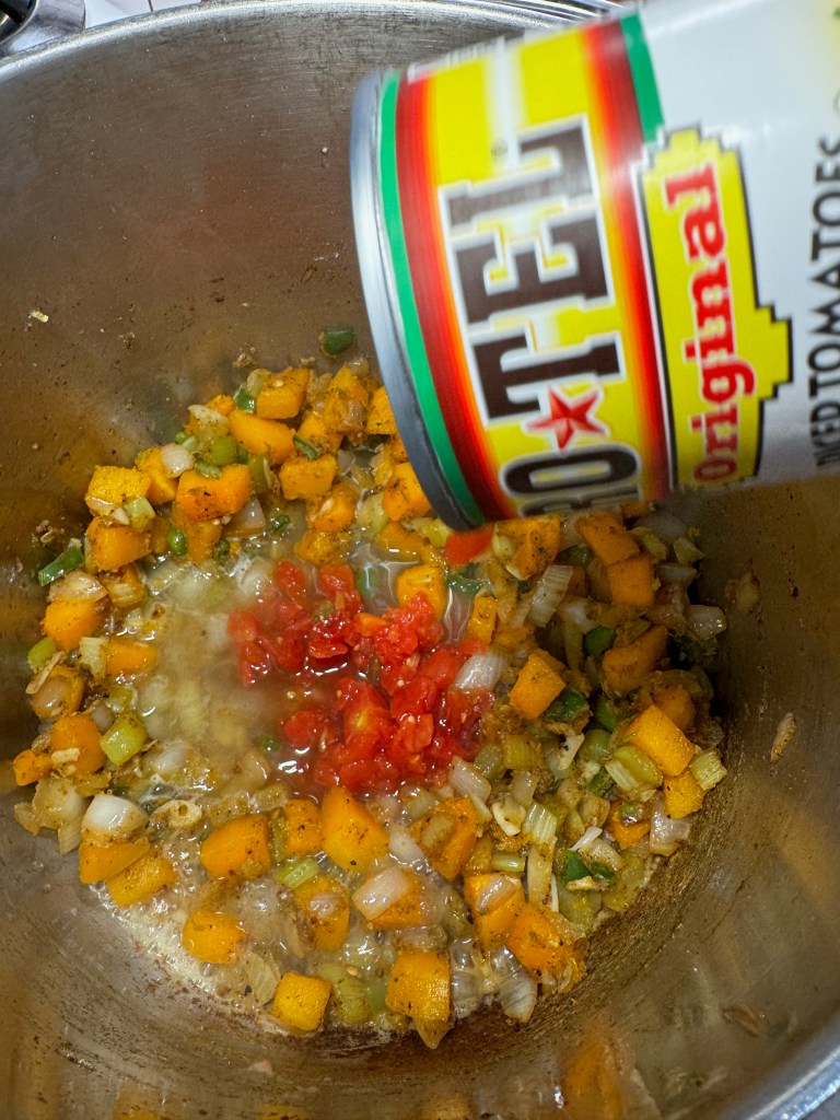 - Add onion, celery, butternut squash and jalapeños (season with salt and pepper)and sauté until softened. Add flour and stir until foamy. Add wine (or vermouth) and water, Rotel and clam juice. Add potatoes, bay leaves and thyme and reduce heat to low. Simmer for about 30 minutes.