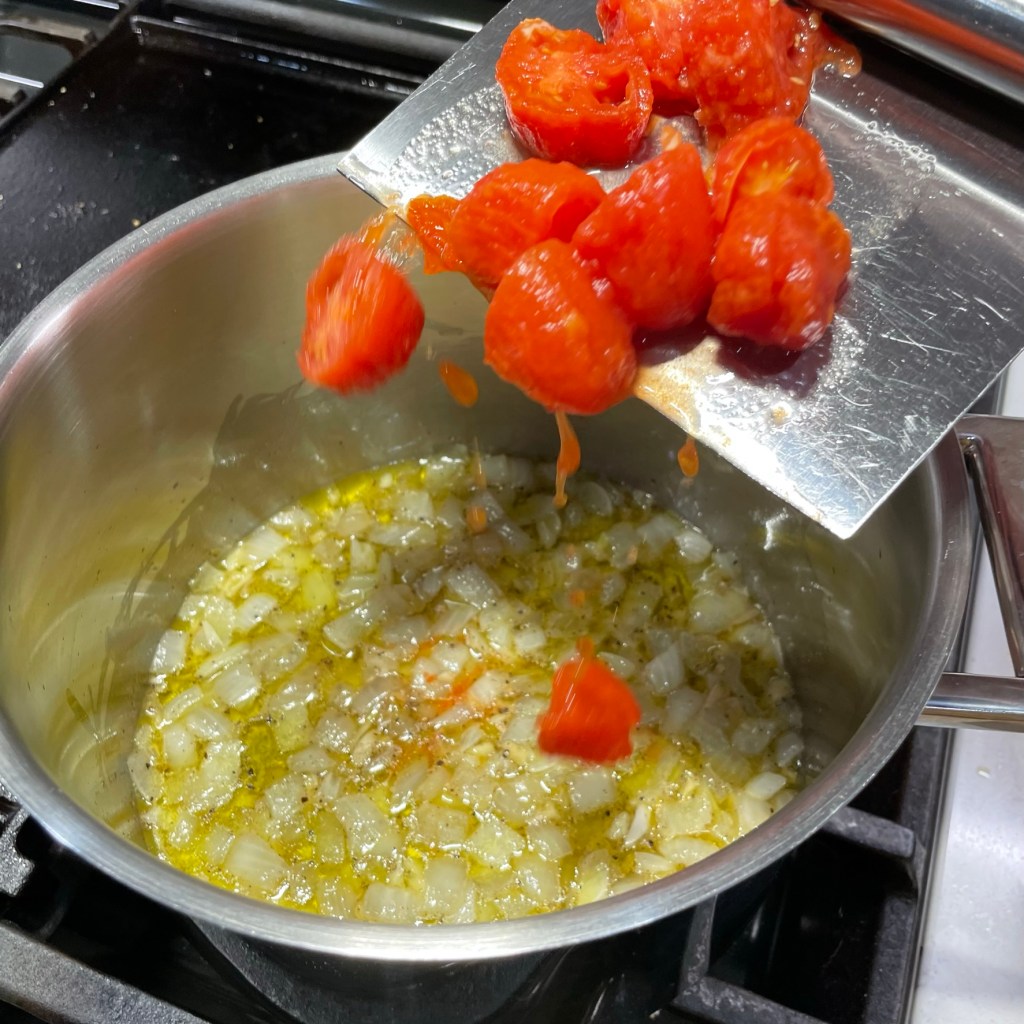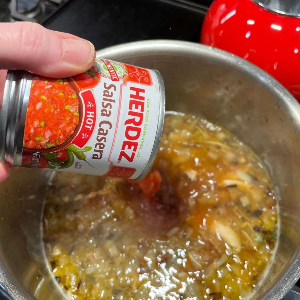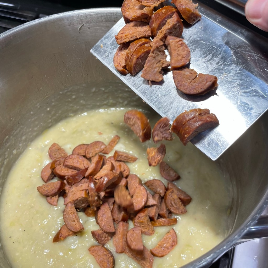 - Add onion, celery, butternut squash and jalapeños (season with salt and pepper)and sauté until softened. Add flour and stir until foamy. Add wine (or vermouth) and water, Rotel and clam juice. Add potatoes, bay leaves and thyme and reduce heat to low. Simmer for about 30 minutes.