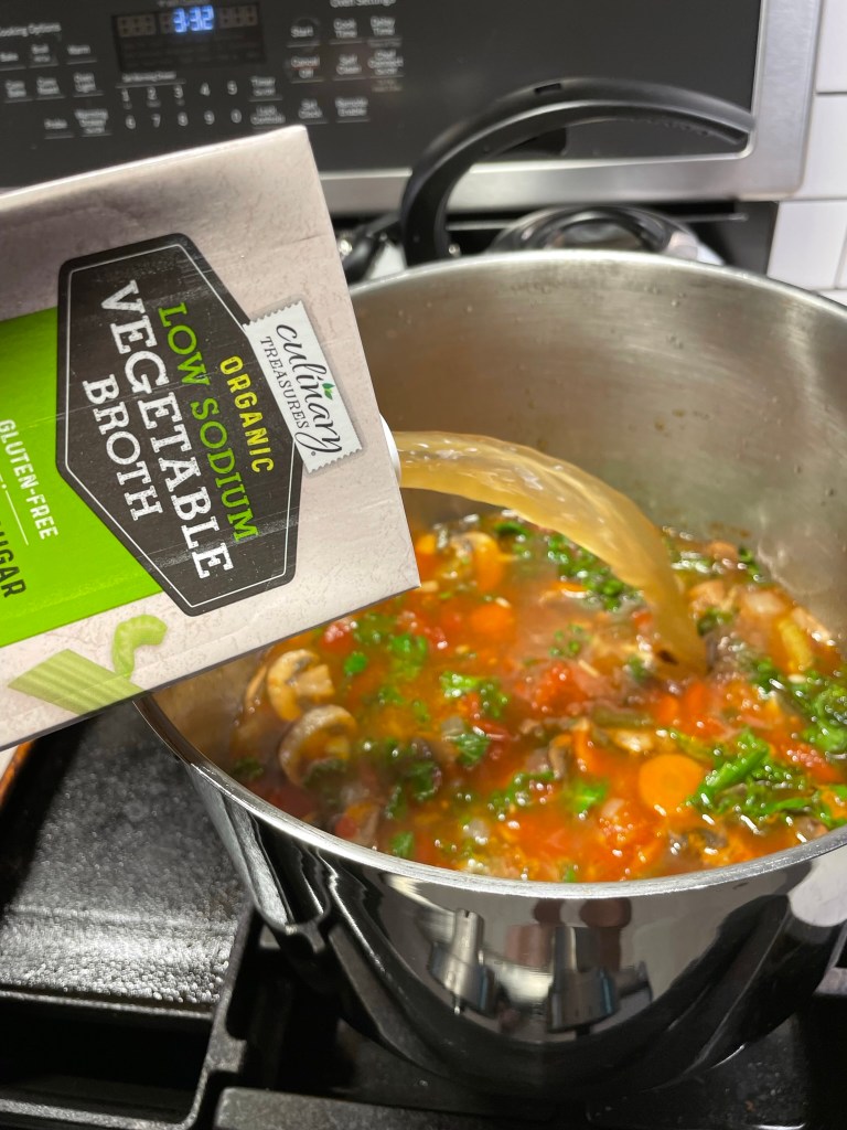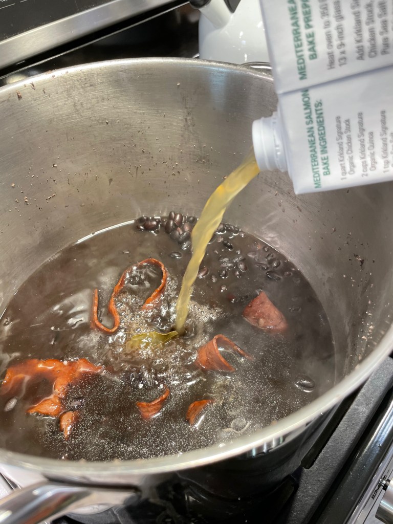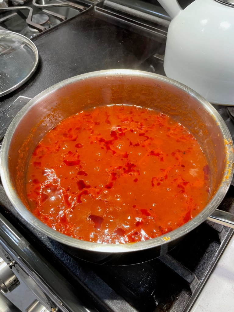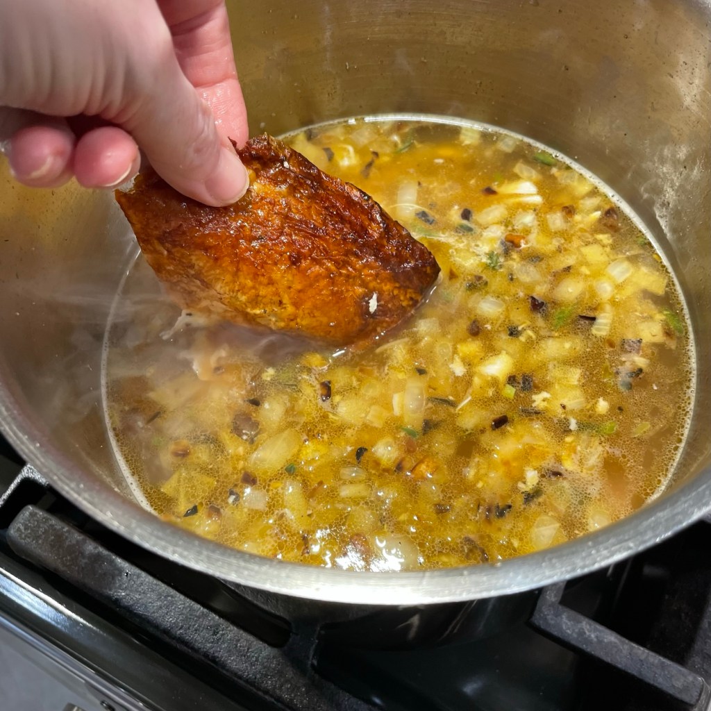 Believe it or not, I did have two bottles of clam juice in the pantry, because I’ve been jonesing to make chowder for over a year. The recipe called for three, but I didn’t mind keeping this on the thicker side. To bring a tiny bit of “Manhattan” into it, I tossed in a can of Rotel tomatoes which also brought another layer of heat, and that touch of acidity was perfect for balancing the flavors. Finally, my sliced Yukon gold potatoes (I didn’t have red), fresh thyme sprigs and dried bay leaves, and then it was time to simmer this hearty, chock-full-of-flavor autumn soup.
