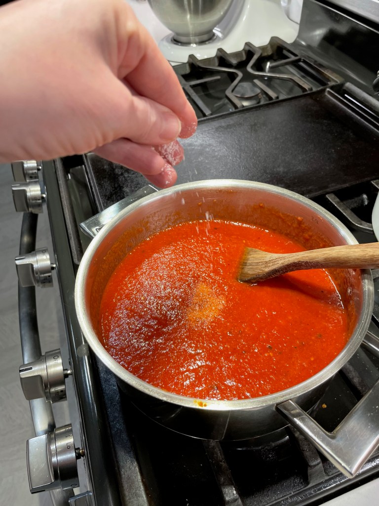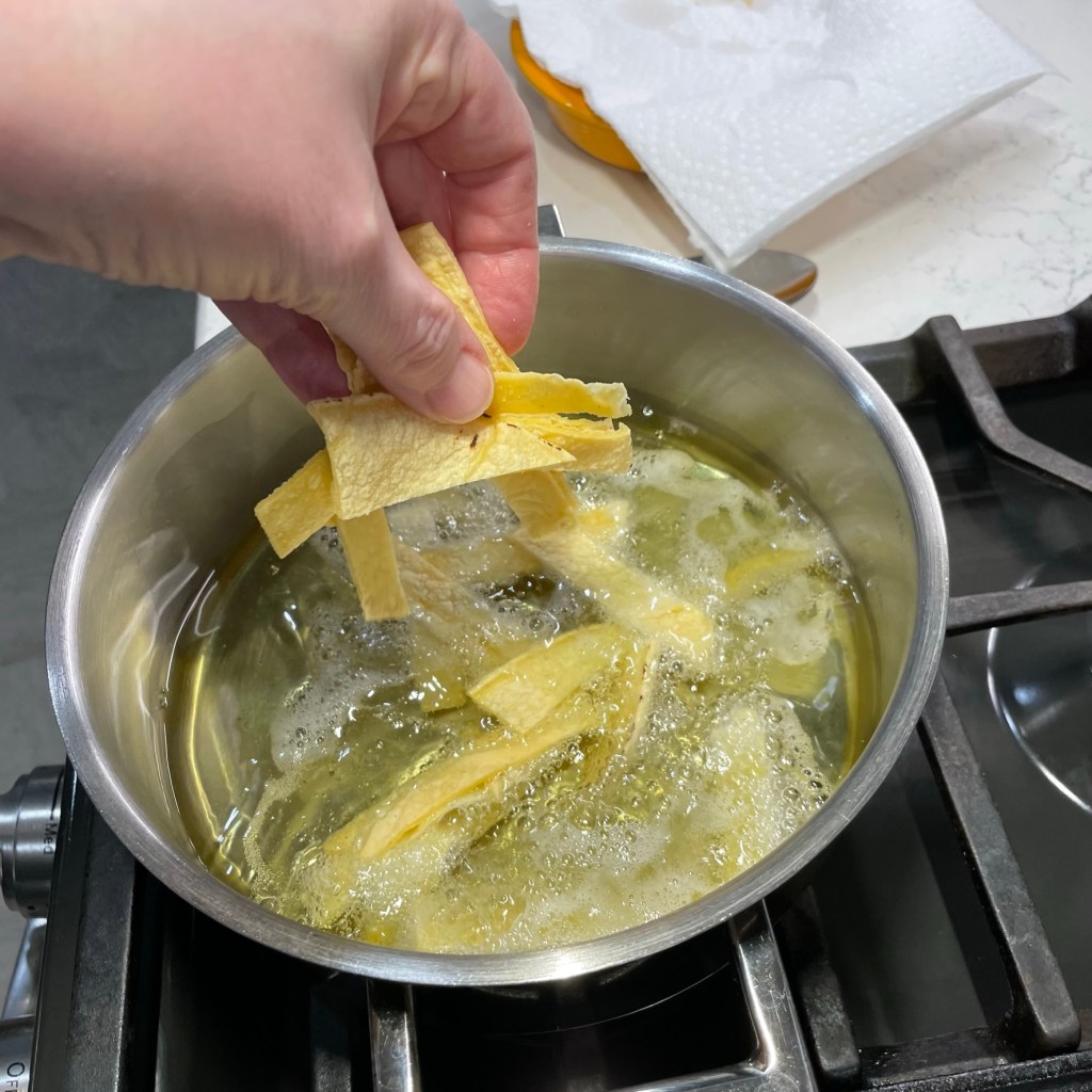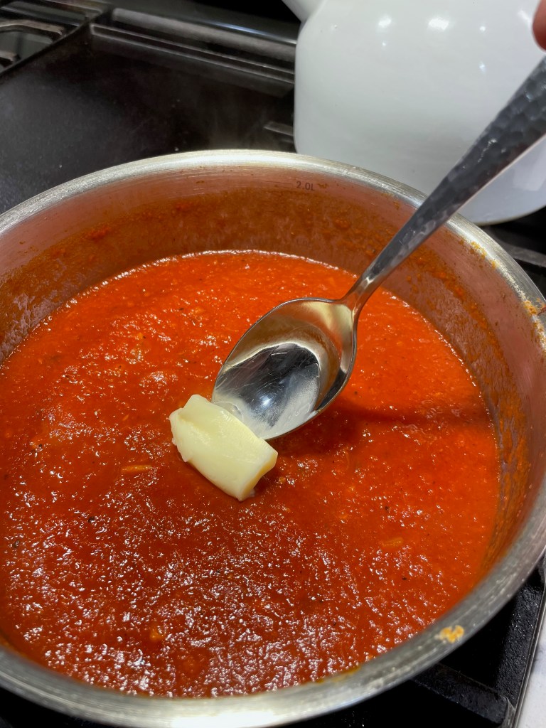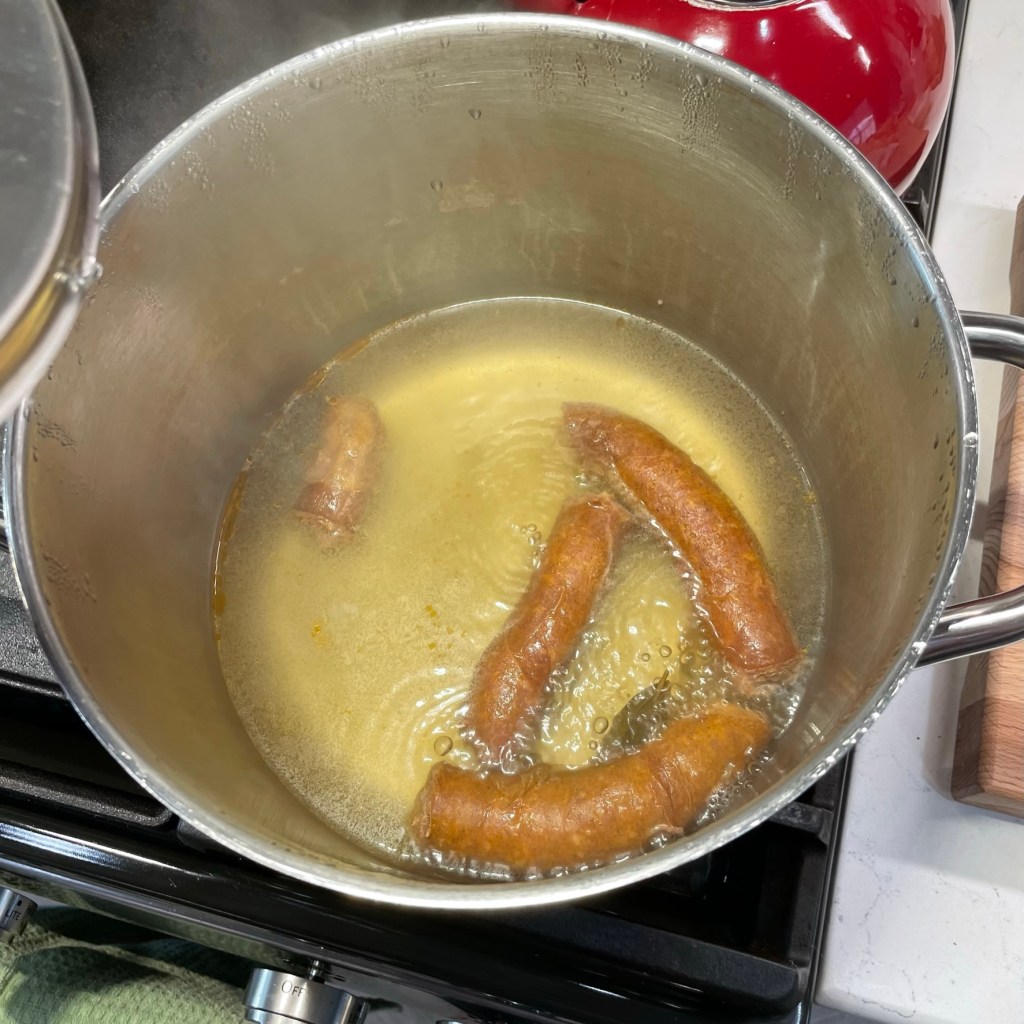 Believe it or not, I did have two bottles of clam juice in the pantry, because I’ve been jonesing to make chowder for over a year. The recipe called for three, but I didn’t mind keeping this on the thicker side. To bring a tiny bit of “Manhattan” into it, I tossed in a can of Rotel tomatoes which also brought another layer of heat, and that touch of acidity was perfect for balancing the flavors. Finally, my sliced Yukon gold potatoes (I didn’t have red), fresh thyme sprigs and dried bay leaves, and then it was time to simmer this hearty, chock-full-of-flavor autumn soup.