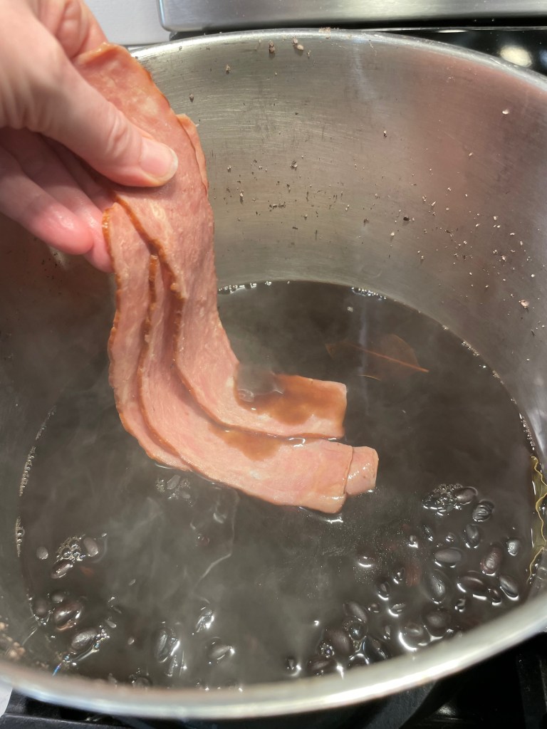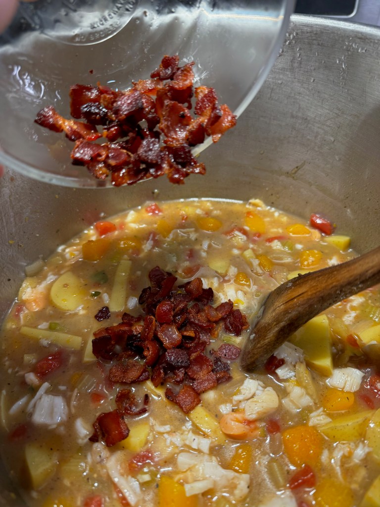 - Gently stir clams (including liquid) into the pot. Add bacon and heat through. Serve right away with hot sauce and saltine or butter crackers.