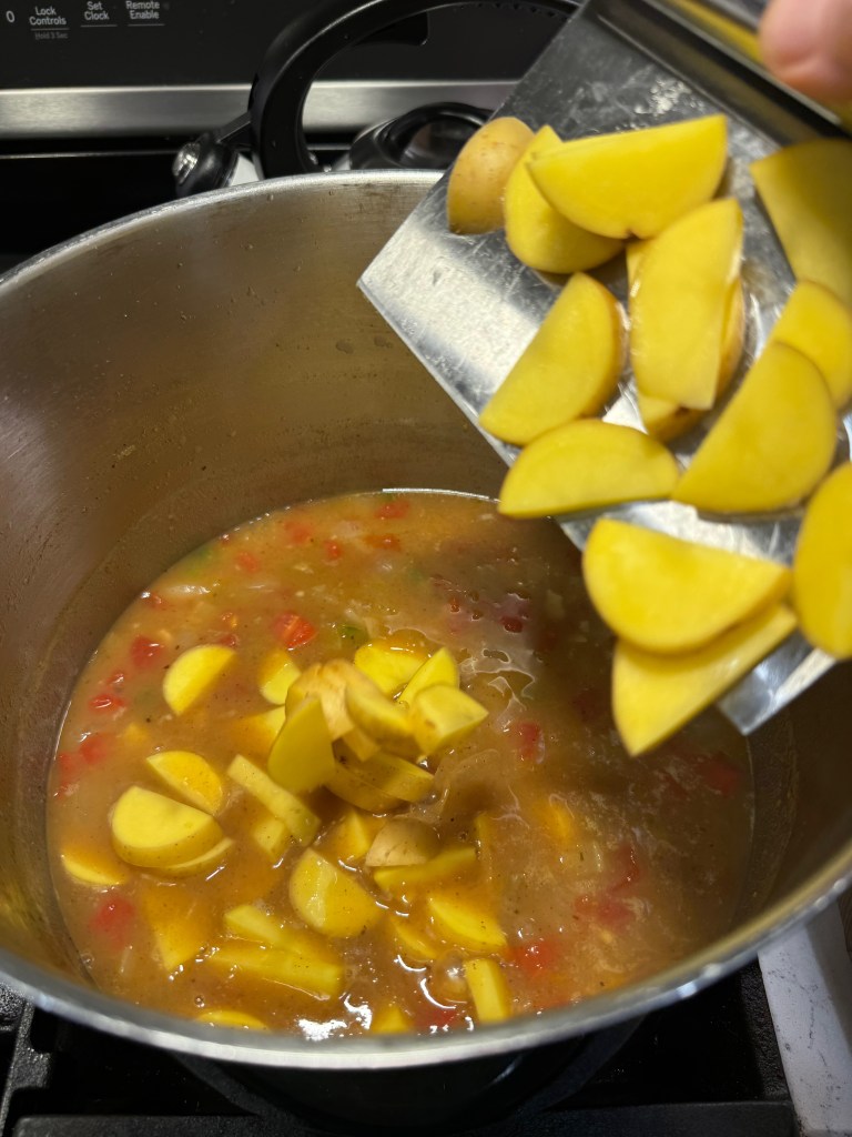 Our state is also well known for many foods, including pulled pork bbq, collard greens and pimento cheese, but this Hatteras chowder that I’ve just learned about is made with fresh-from-the-Atlantic clams, red potatoes, bacon, onion, celery, carrot, white wine, herbs and clam juice. As written, the recipe sounds delicious. But you know me, I have to make it my own.
