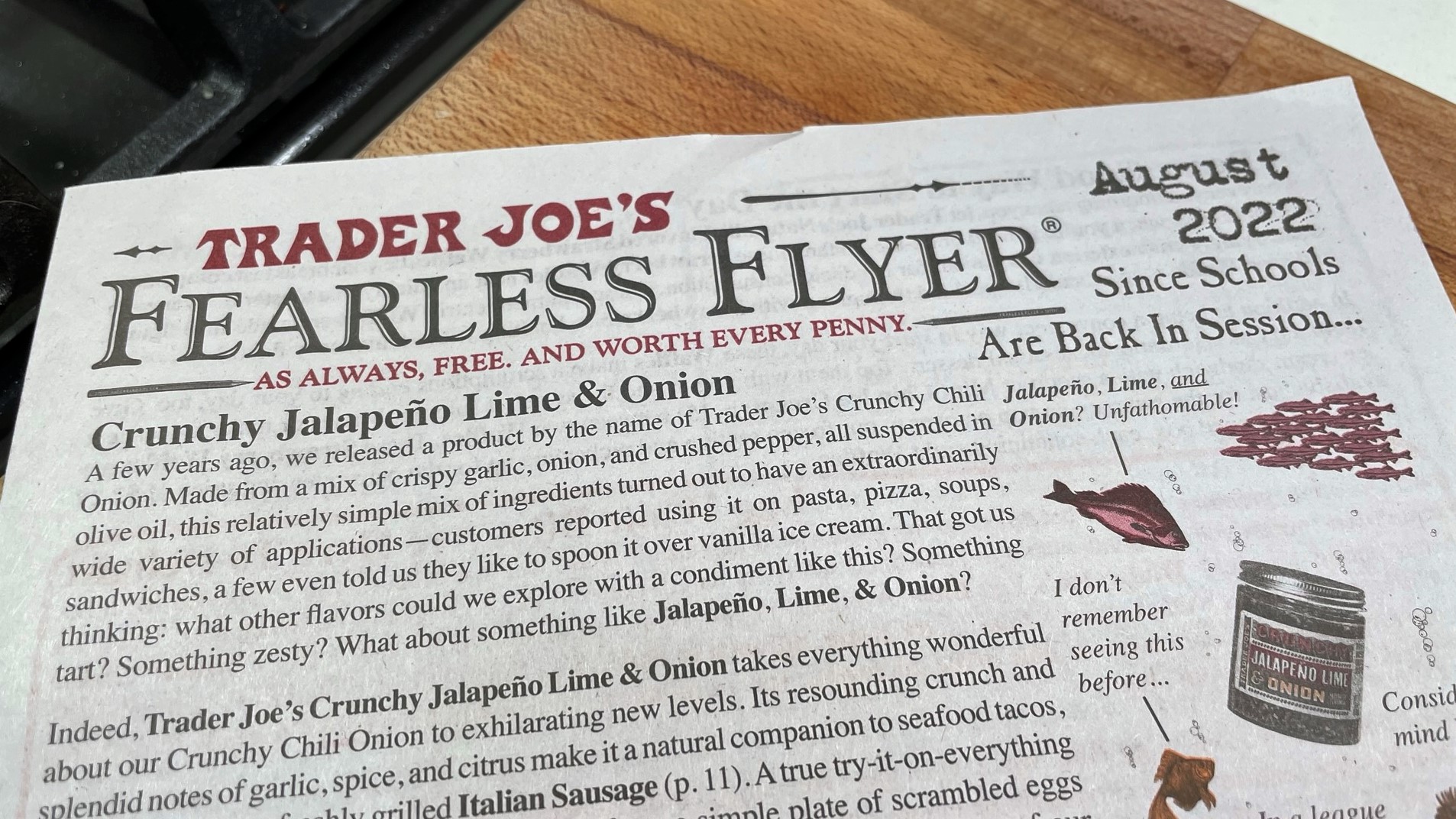 Oh, if I had a nickel for every time I’ve made a trip to TJ’s for something I’ve gotten excited about only to find it gone. If you dare to ask for something that is even one minute expired from their scheduled inventory, you can bet your pumpkin spice one of their uber-cheerful employees will inform you that the item was—wait for it— “seasonal.” This is their first, go-to answer. It’s so aggravating, and sometimes, it seems like an easy excuse. This idea of retiring products makes sense to a point. I don’t expect Trader Joe’s to have pumpkin spice baton cookies in April, but what about when I’m trying to find the brand-new Crunchy Jalapeno Lime and Onion condiment that was literally in the Fearless Flyer ad I picked up on my previous-week visit?