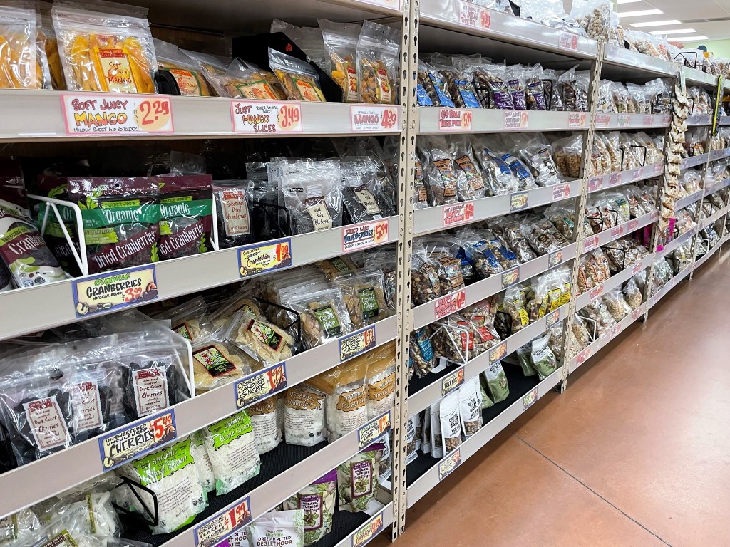 I mean, an entire aisle length of every kind you can imagine and then a bunch more that you didn’t. They have dried sweet cherries and dried Montmorency tart cherries. Raisins and golden raisins and jumbo raisins. Raisins mixed with dried cherries, blueberries and cranberries (this is the “Golden Berry” blend that my hubby enjoys on his morning cereal). Dried figs and apricots and bananas—you get the idea. Same with nuts, and not only every variety imaginable, but also options for roasted or raw, salted and unsalted, even 50% salted! Whole nuts or halves and pieces. Don’t even get me started on the imaginative flavor combinations they put on the nuts, like the spicy Thai, Lime and Chili cashews, Everything But the Bagel mixed nuts, or the brand new Crunchy Chili Onion peanuts (I just bought a bag this week—I’ll let you know).