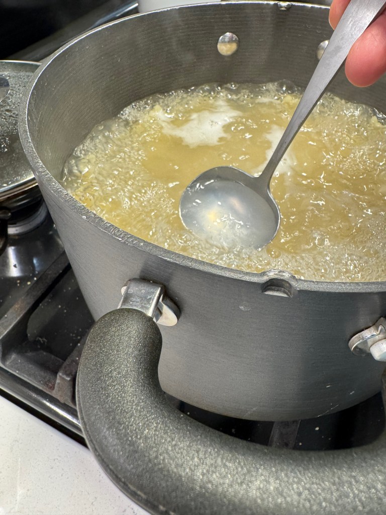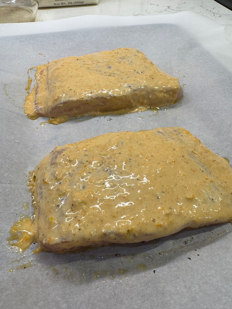 A wedge salad is exactly that— a wedge of the lettuce head— and so I cut this crunchy iceberg in half, then halved one side again for our two portions. The dressing is spooned over the cut edge so that it runs down the sides, and then it was simply a matter of piling the other ingredients on and around it, finishing the salad with all those lovely Mexican street corn flavors. We used the Tajin-flavored feta that Les had found for the potato salad, and it was a perfect stand-in for the bleu cheese you’d normally find on a wedge.