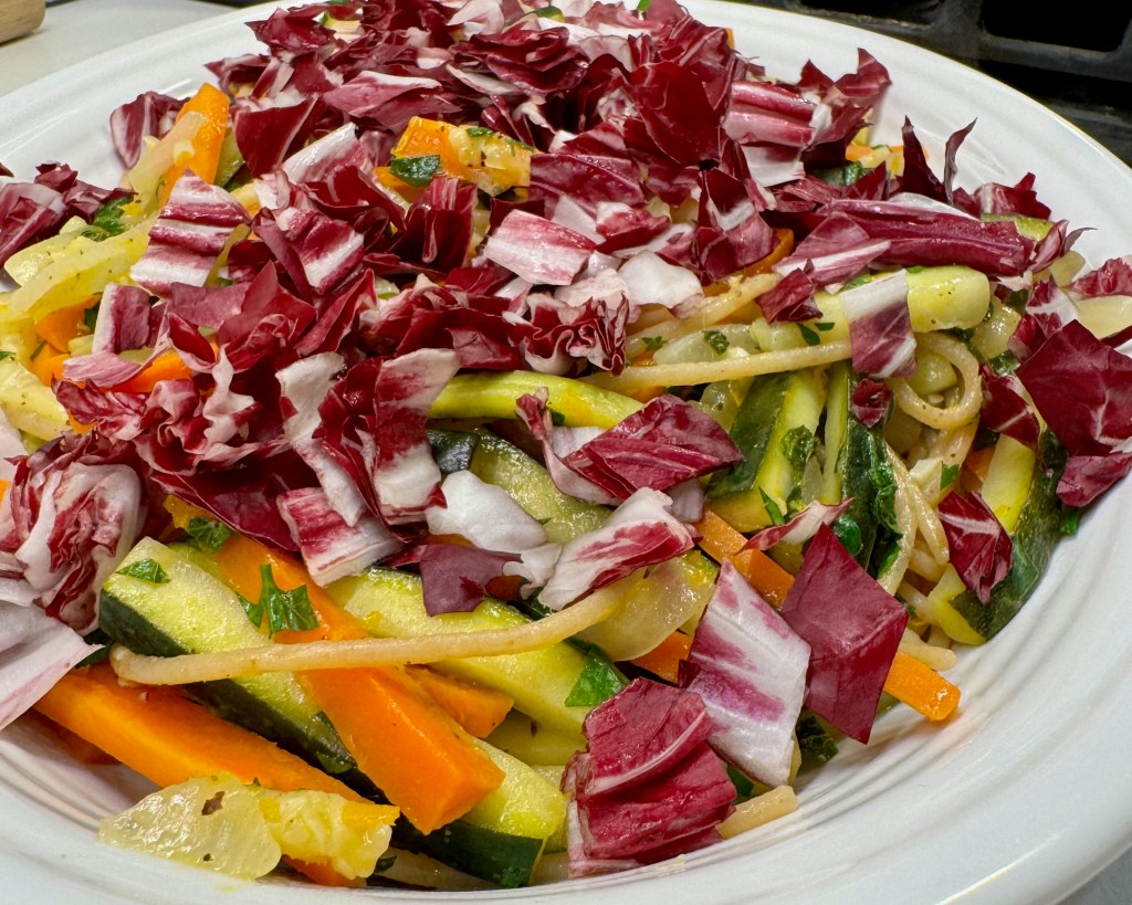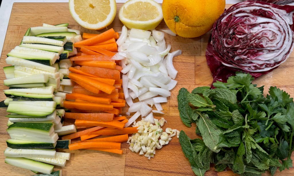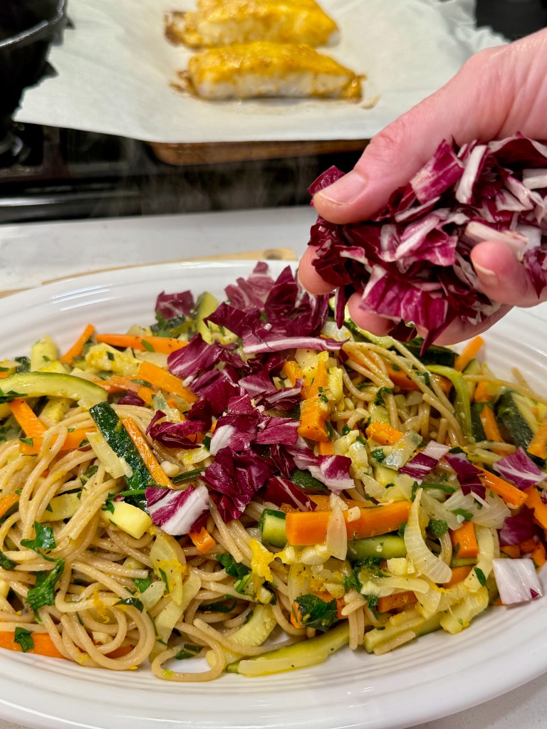 - 1/2 ripe avocado, cubed and dressed with a squeeze of fresh lime to preserve color