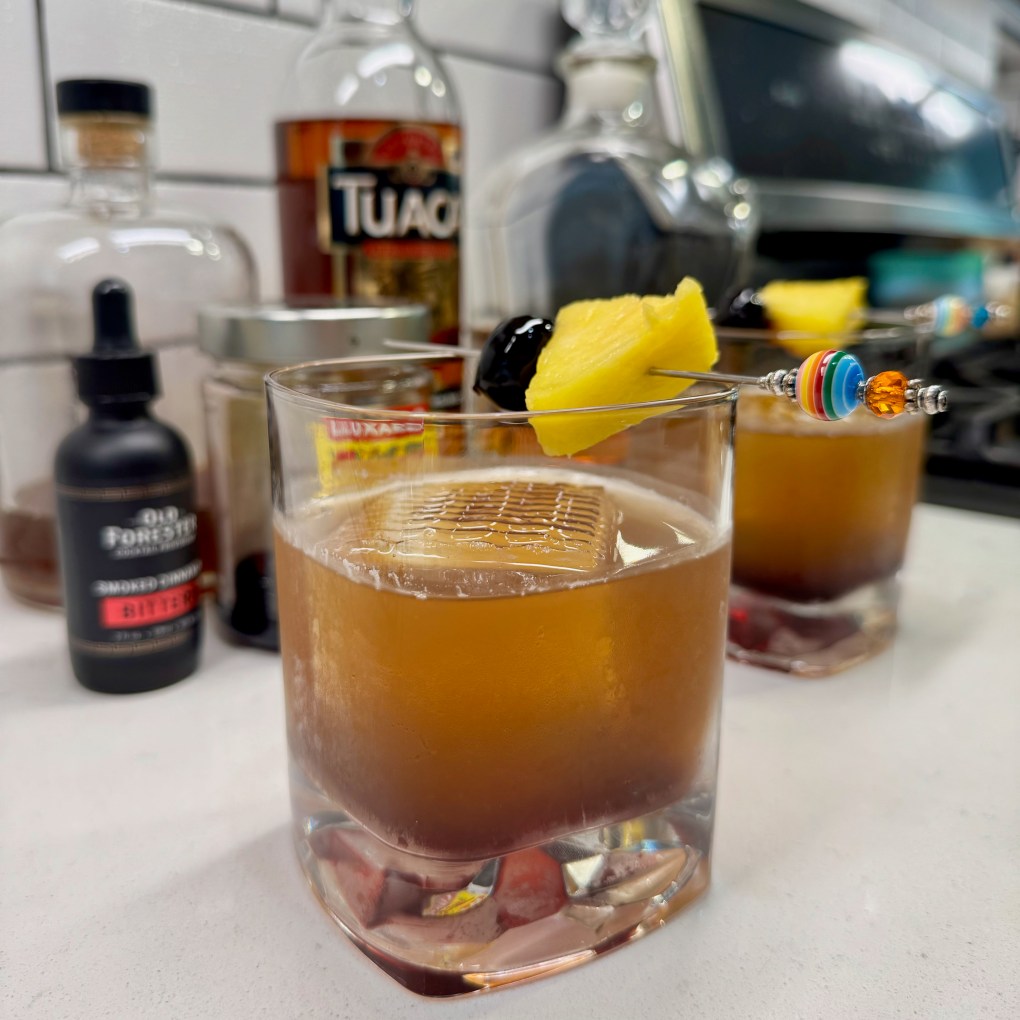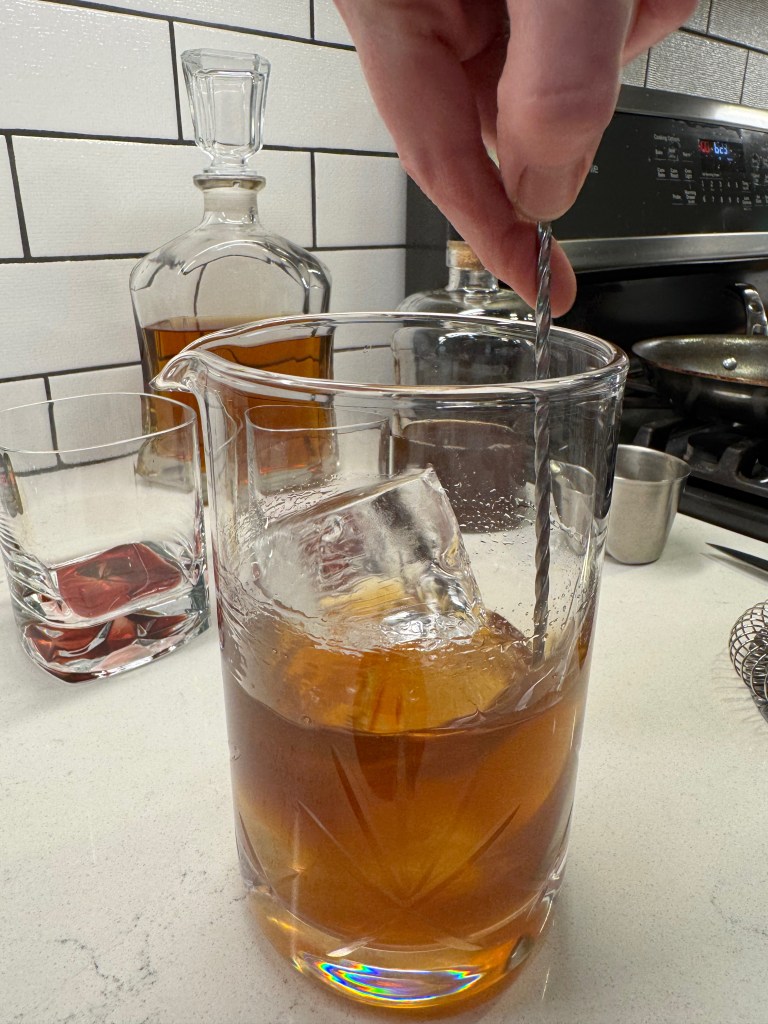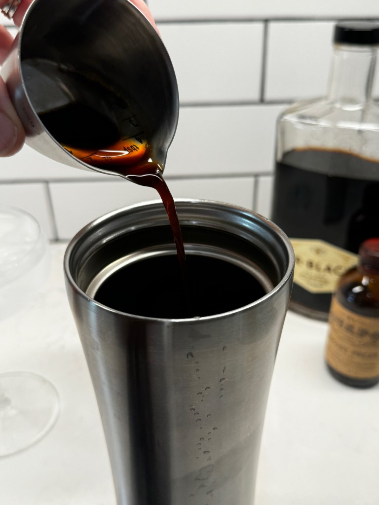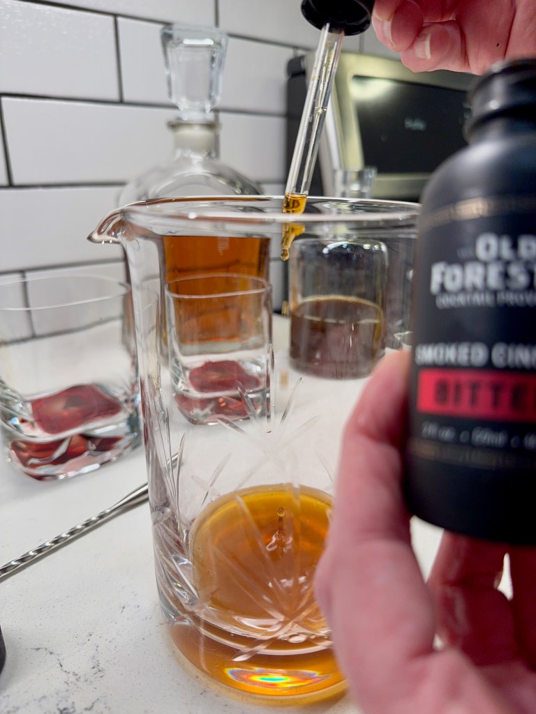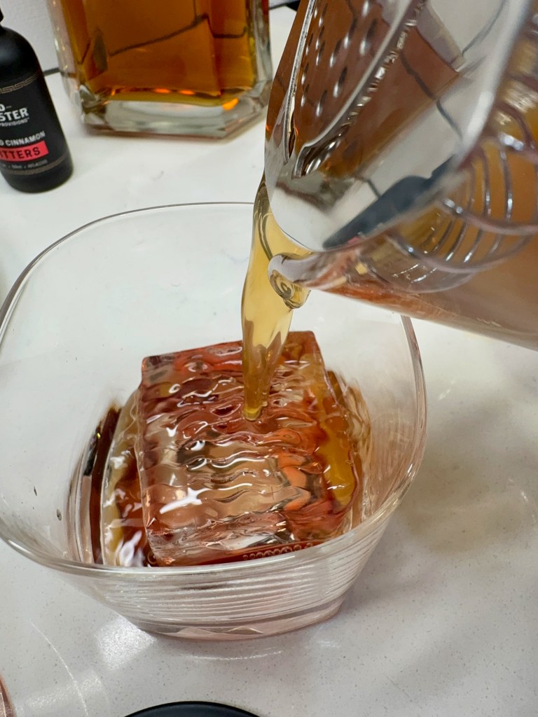 - Combine bourbon, syrup and bitters in a cocktail mixing glass or shaker. Add one cup of ice and stir for about 20 seconds. Strain over a large ice in a double rocks glass.