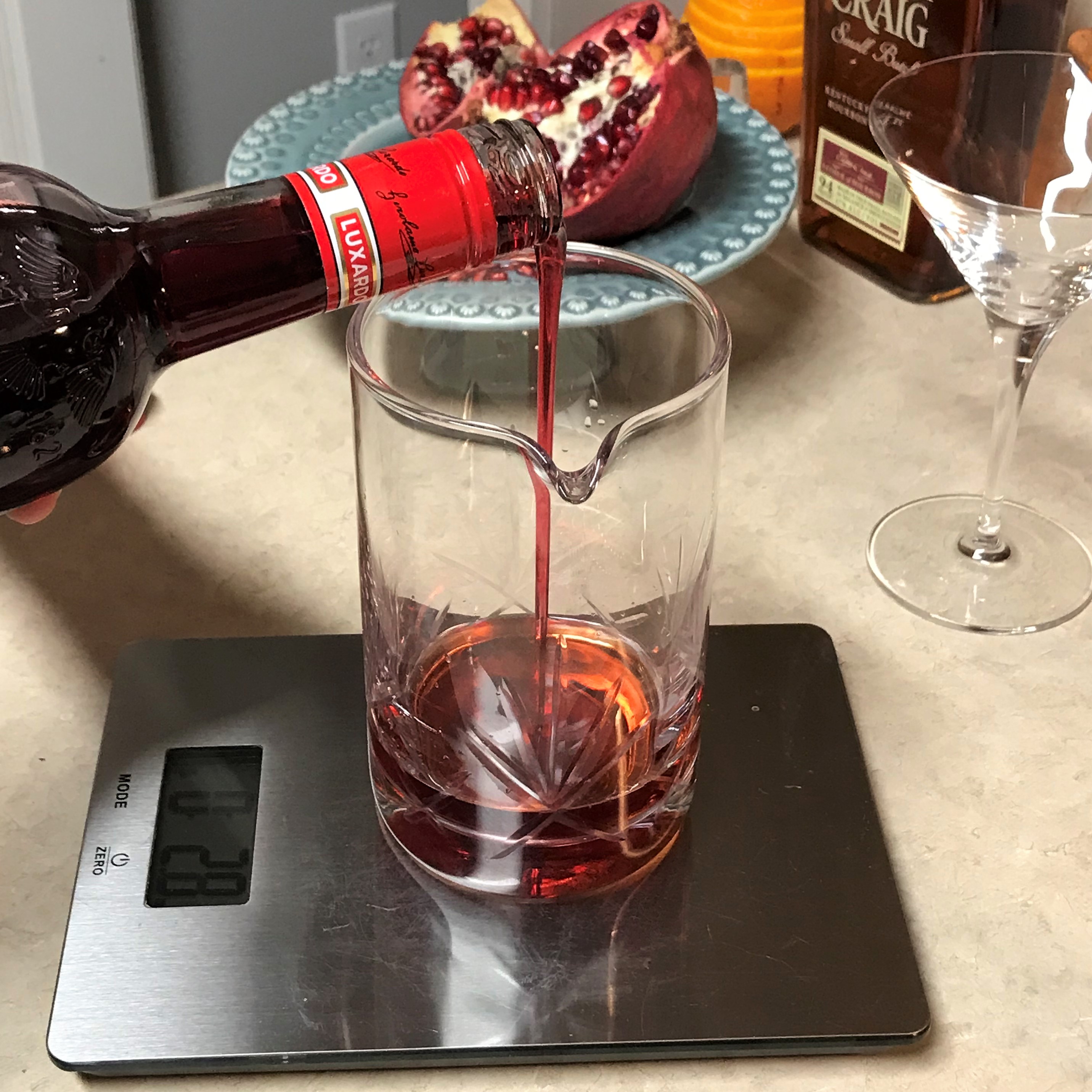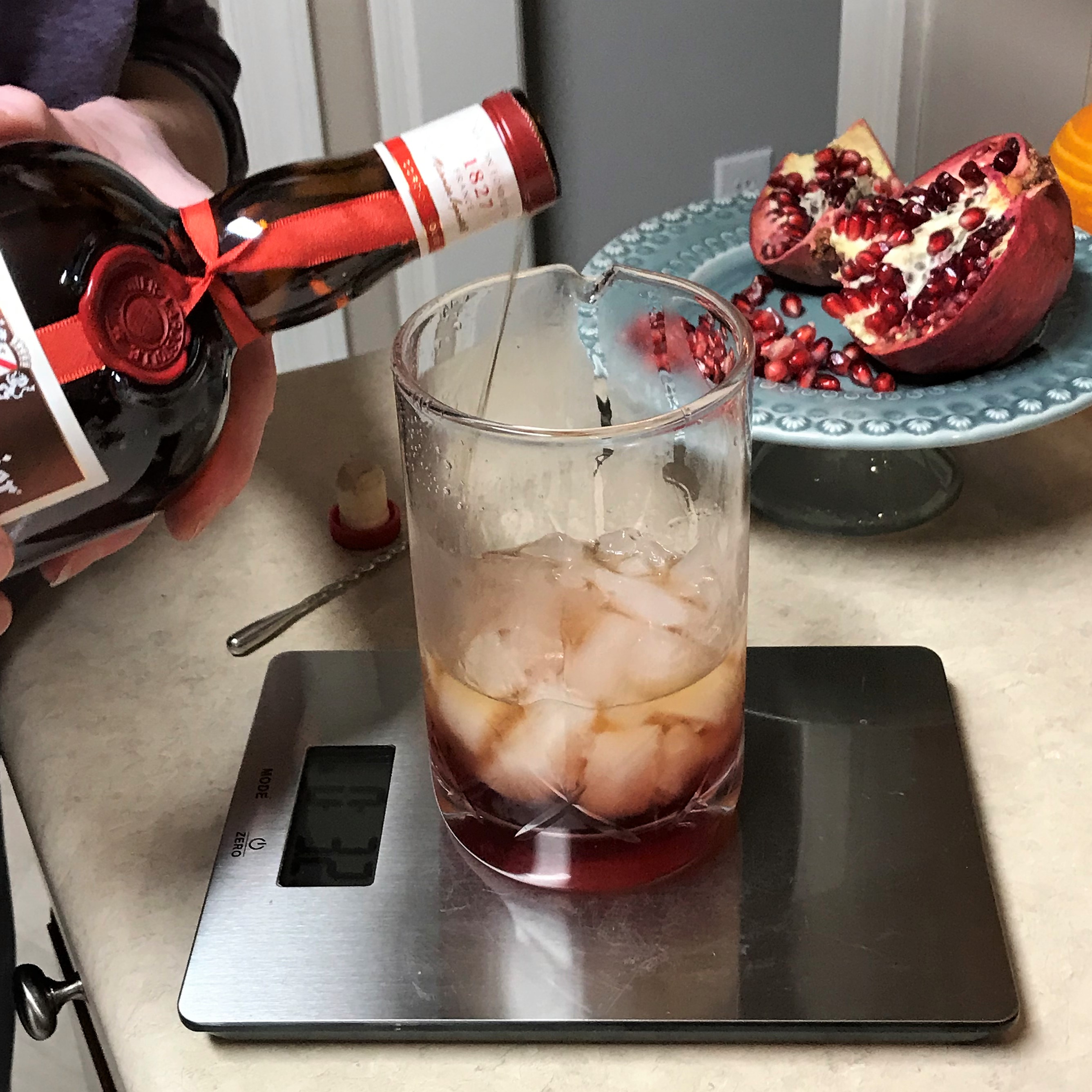The ingredients are simple, though one required a bit of advance effort. Rather than use a store-bought cranberry juice (which I didn’t even consider, frankly), I made a simple syrup infused with fresh cranberries, cinnamon for warmth and pink peppercorns for depth. Simple syrup is exactly that—simple. Just equal parts by volume of sugar and water, and for this one, I added the flavor infusers long enough to draw out the color of the cranberry. The rest of the drink is very Manhattan-like; a quality brand of red vermouth and a few shakes of bitters, with a premium cocktail cherry as garnish.