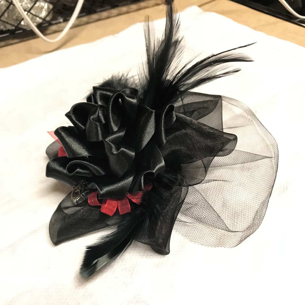 I’ve also, on occasion, made fascinators for other people in my circle. One friend was having an unconventional wedding (wearing black lace, and believe me, she could pull it off) so I made a black rose fascinator for her, complete with a detachable birdcage veil and matching clips for her daughters.