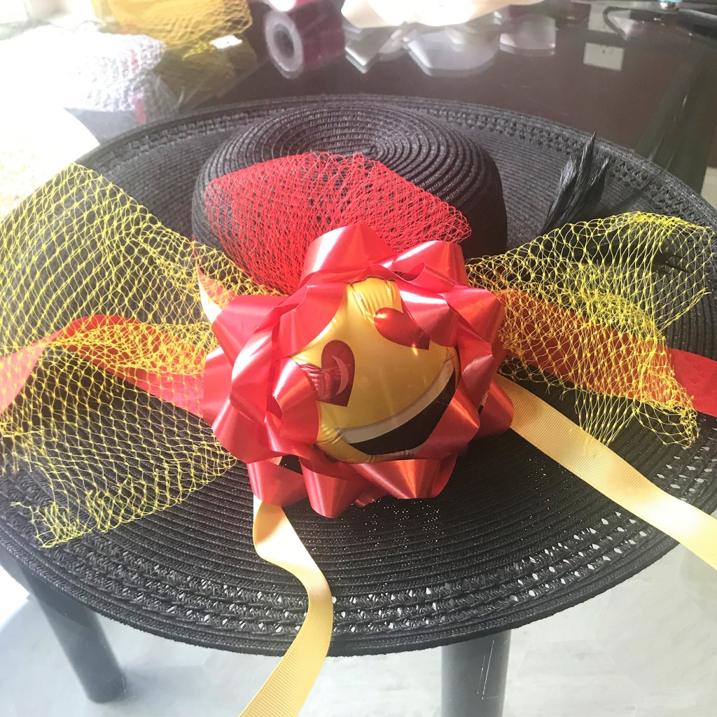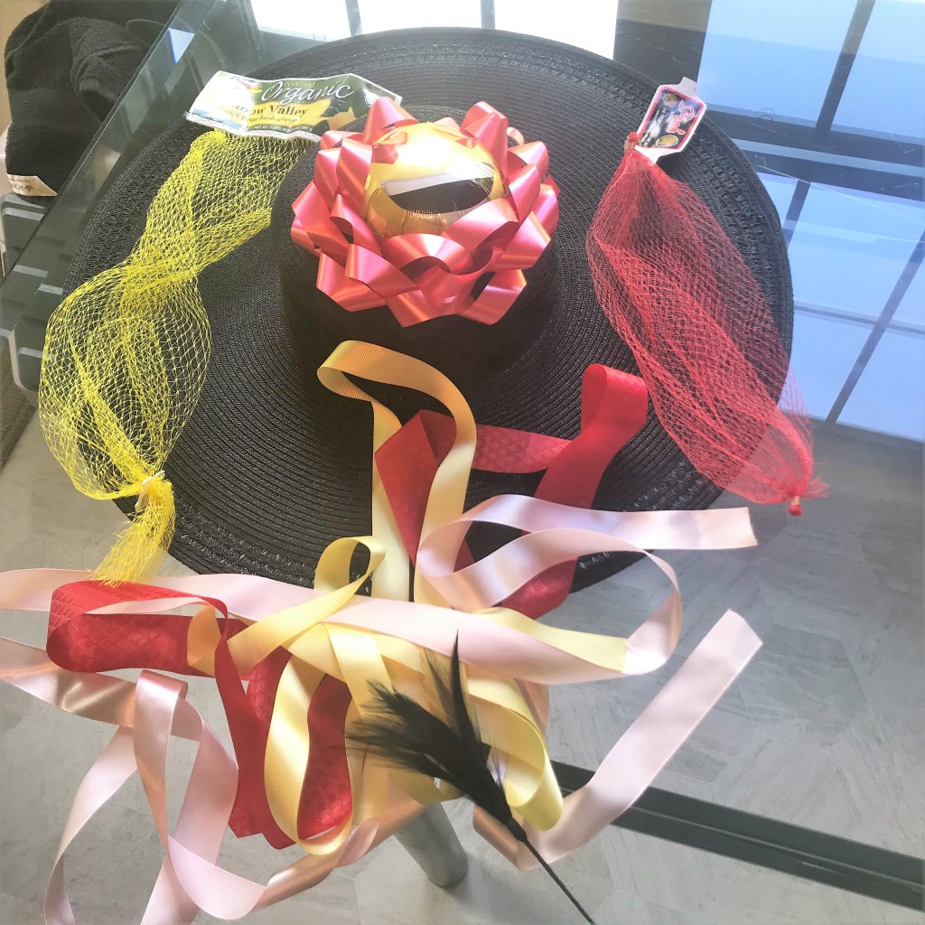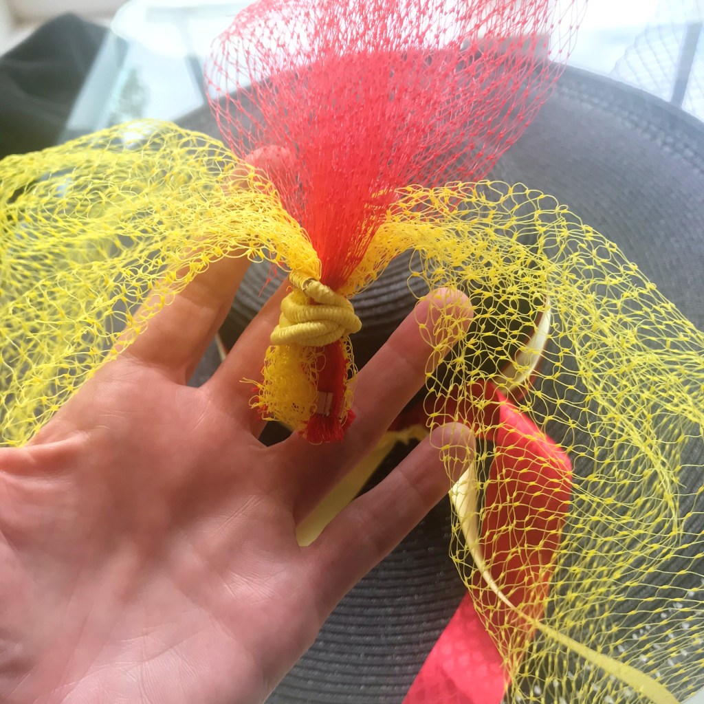 For the black hat, which is extra wide and floppy, I want something flashy and bold. I’m choosing random ribbons from my sewing kit, the lemon and onion mesh bags, and an emoji gift bow I found in our wrapping paper bin. Oh, and a black feather left over from my friend’s black wedding fascinator. The onion bag is crimped at the ends, which is actually working in my favor. I’m going to cut open the lemon bag for more flexibility.