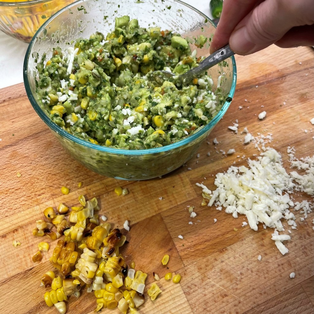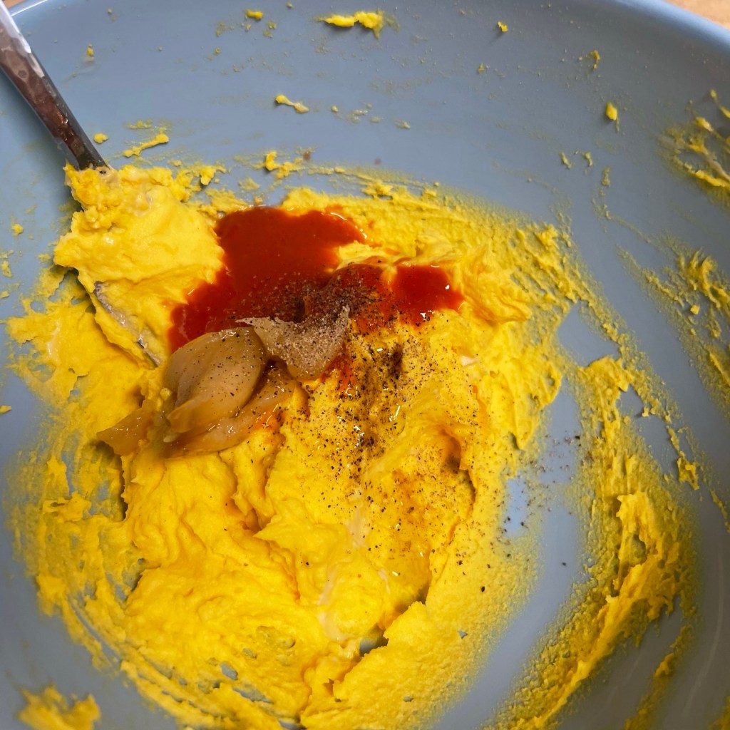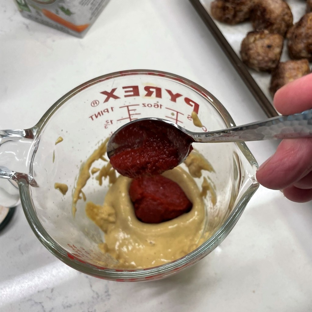 Use the large bowl of a food processor (or a good blender with the vent cover off) to combine the warm chickpeas plus a little bit of the liquid, half a roasted sweet potato, some tahini and salt. Pulse several times until you have a somewhat smooth mixture of hummus. This was my first shot at using harissa in hummus, so I gave it a quick sample test and found it to be a great pairing with the sweet potato! If you are not familiar with harissa, it’s a spicy chile pepper paste common to Morocco and other mideast cultures. It usually includes some variety of chiles, plus garlic and seed spices, such as caraway, coriander and cumin.