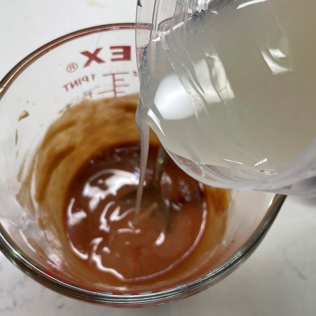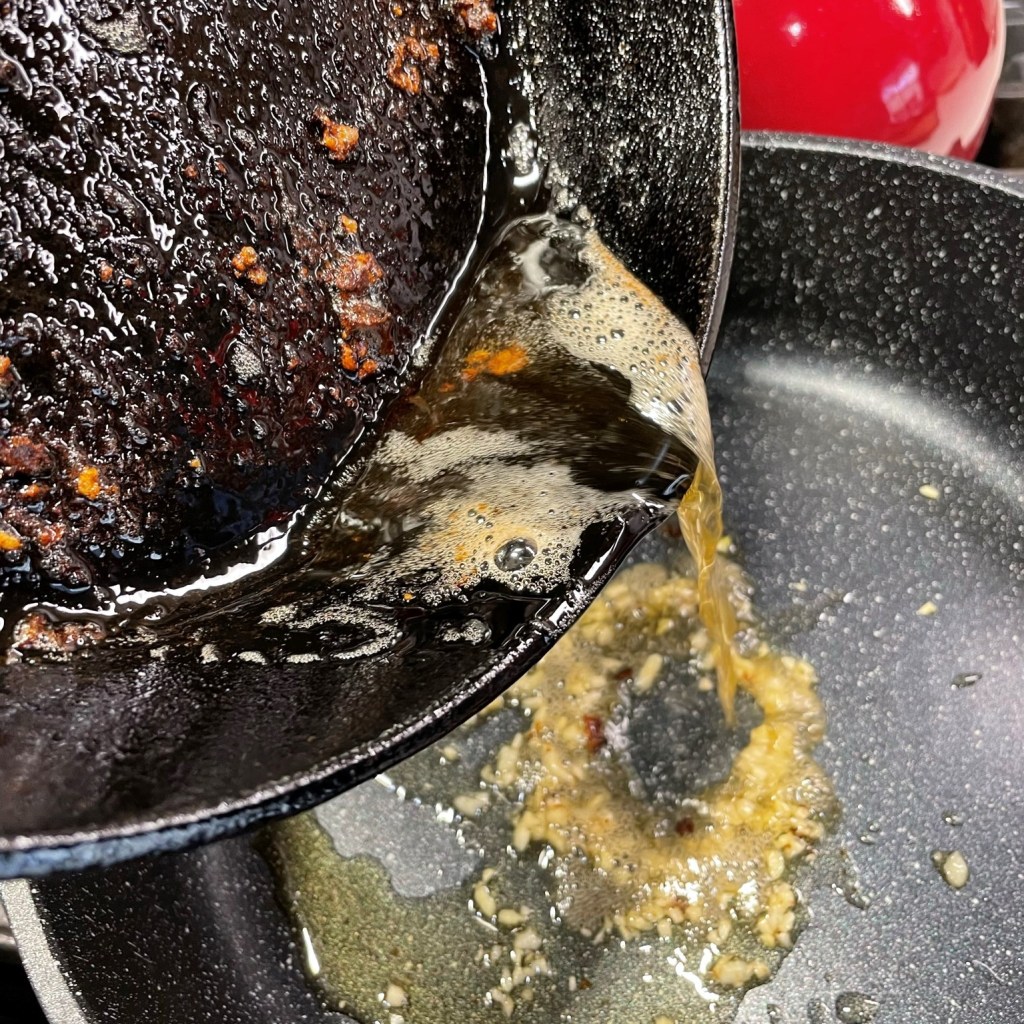 - Pour entire can of garbanzo beans (including the liquid) into a small saucepan over medium-low heat. Add baking soda and bring to simmer until you notice light boiling around the edges and steam rising from the pan. Remove from heat and strain the beans, reserving the liquid.