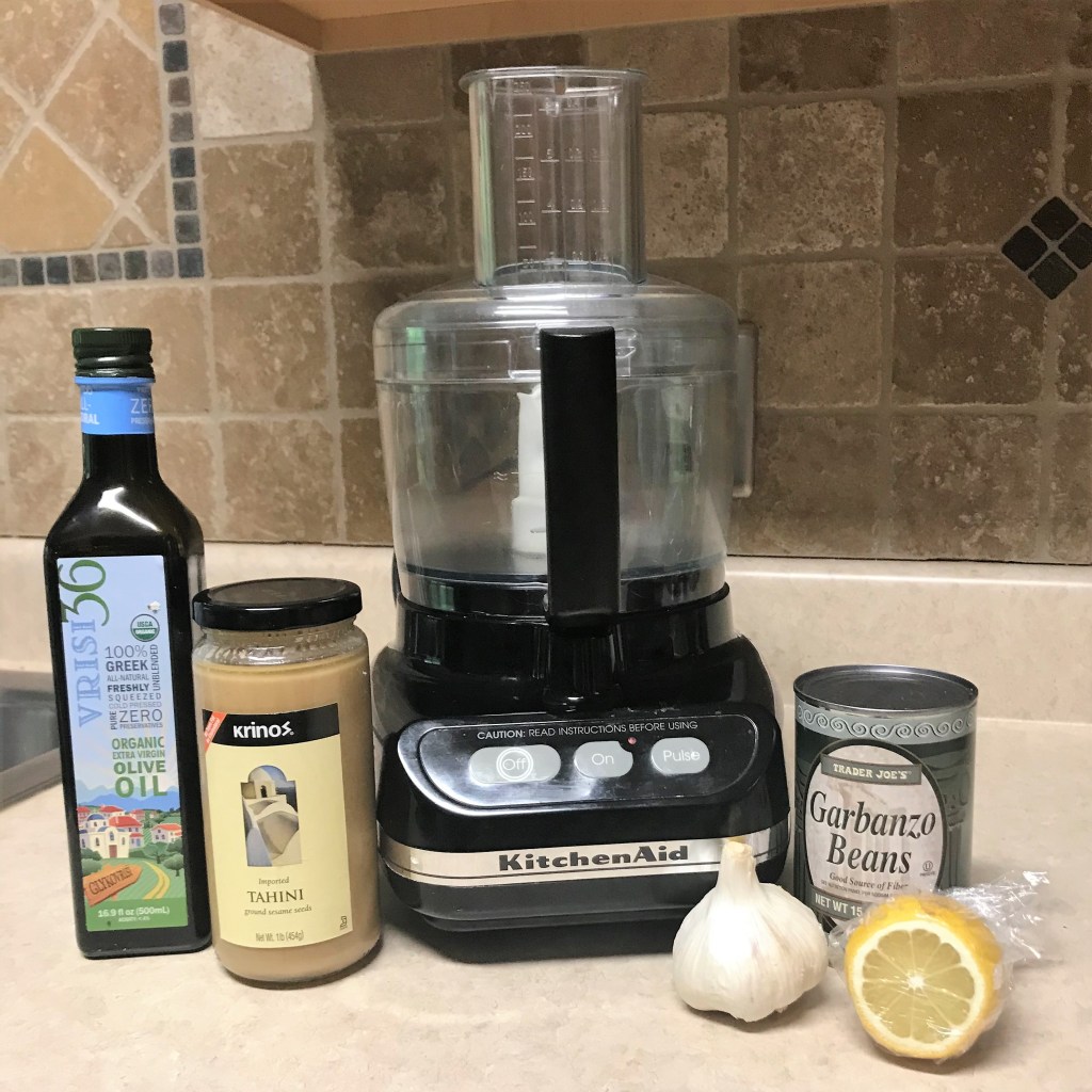 A food processor is one of the most helpful tools in my kitchen. And as you can see, the ingredients for making easy hummus at home are pretty basic.