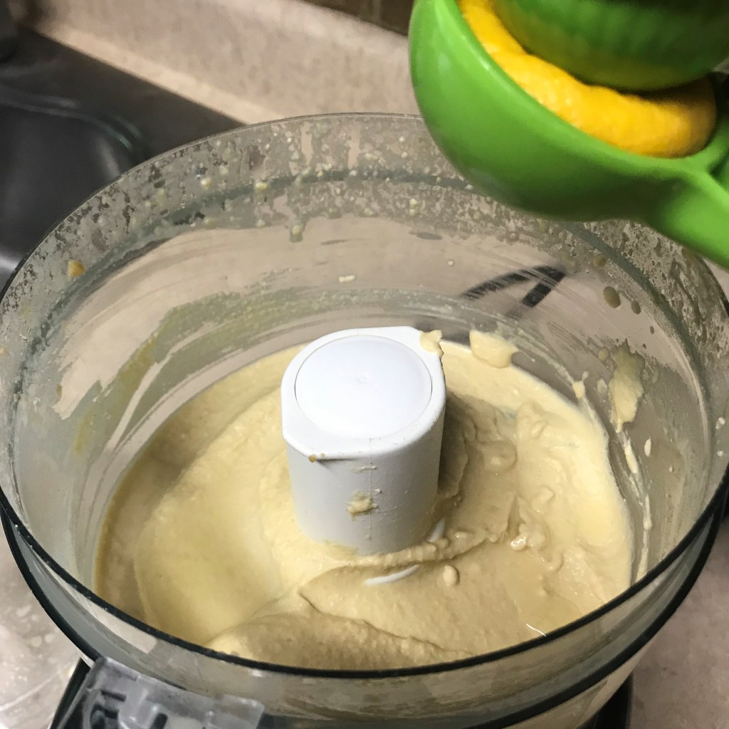 When you’ve reached the desired consistency, turn off processor, squeeze lemon juice into the hummus and pulse a few times to blend; add sea salt to taste. Transfer the mixture to a covered container and chill a few hours until ready to serve.