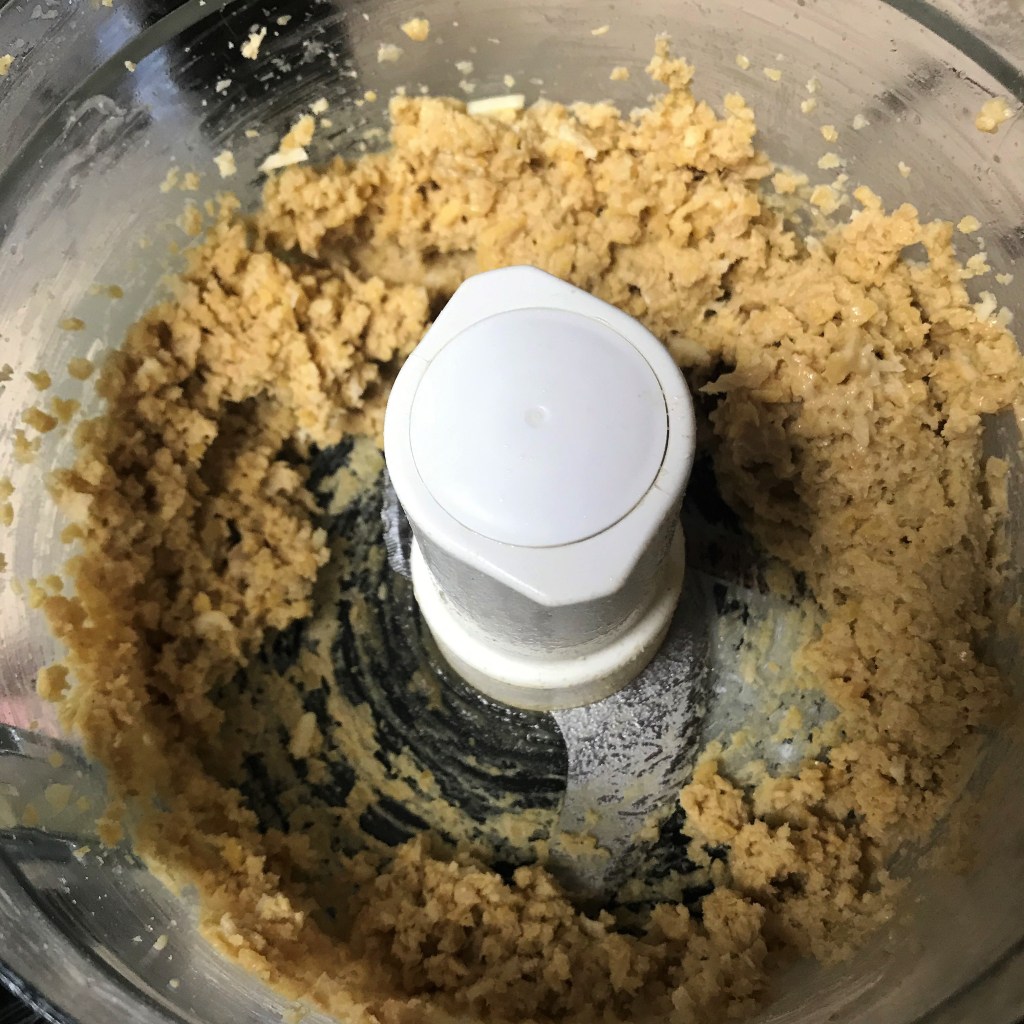 With minimal liquid, the processed bean mixture will look rough like this; it’s okay though, because you’re just getting started.