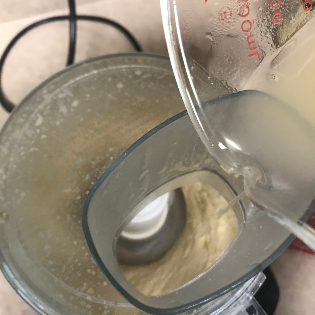 A steady, slow drizzle is what you’re going for in this stage of mixing. You’ll do this with both the olive oil and the warm bean liquid. Keep watch as you go, and stop as needed to scrape down the hummus mixture from the sides of the bowl.
