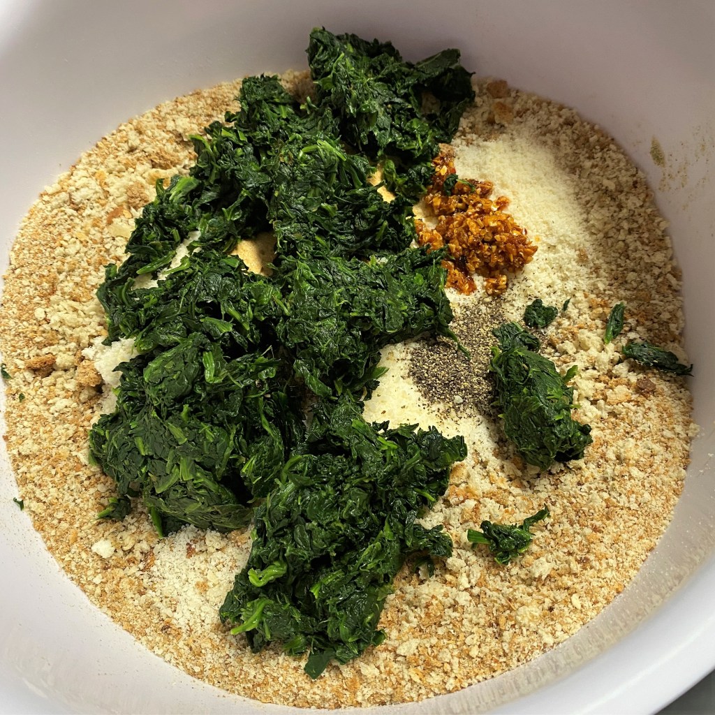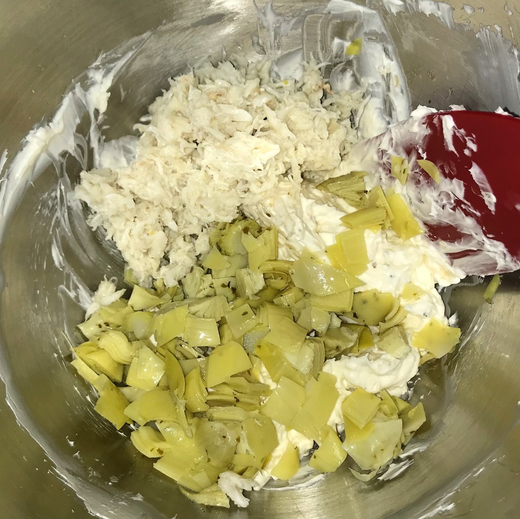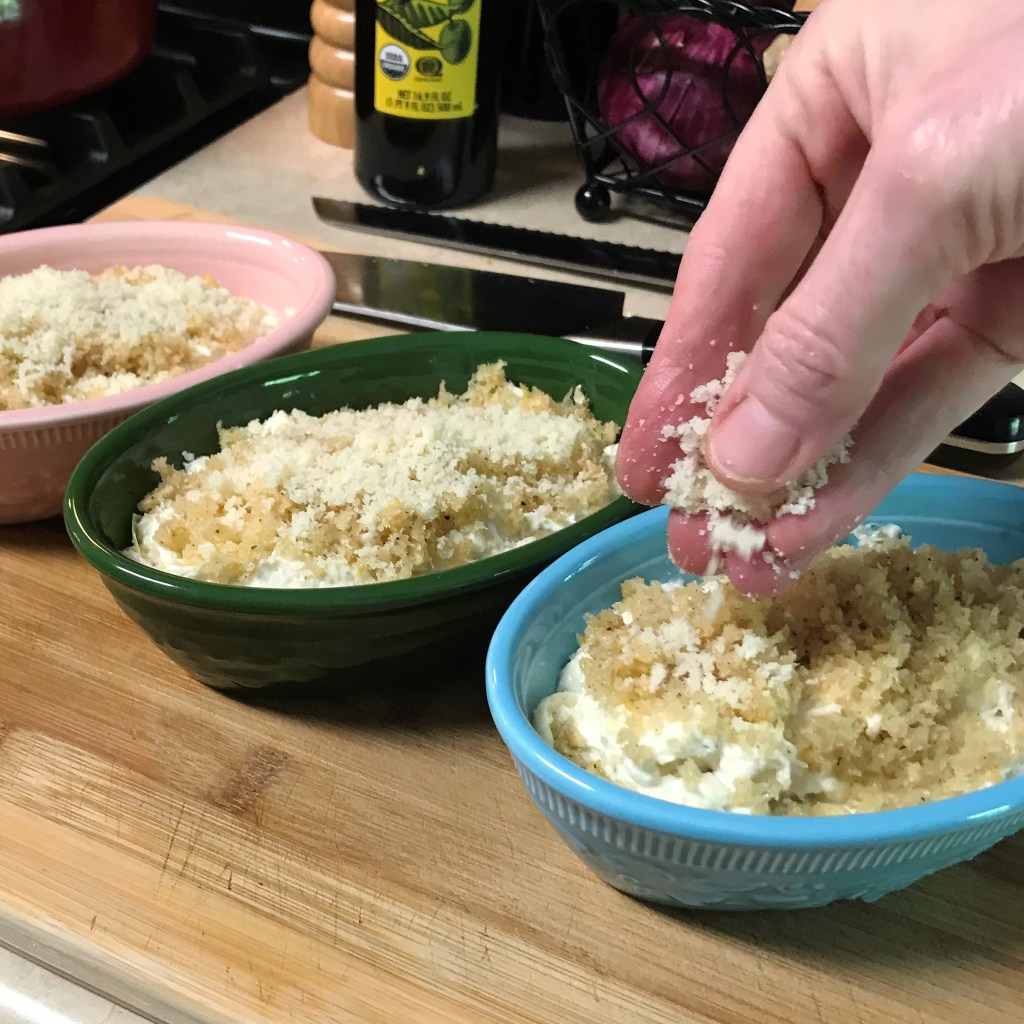 Sprinkle the buttered crumbs evenly over the crab-artichoke mixture, then sprinkle with parm-romano blend and cover with foil and tuck it into the fridge until you’re ready to bake.
