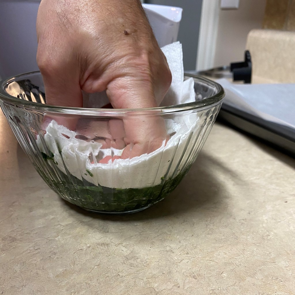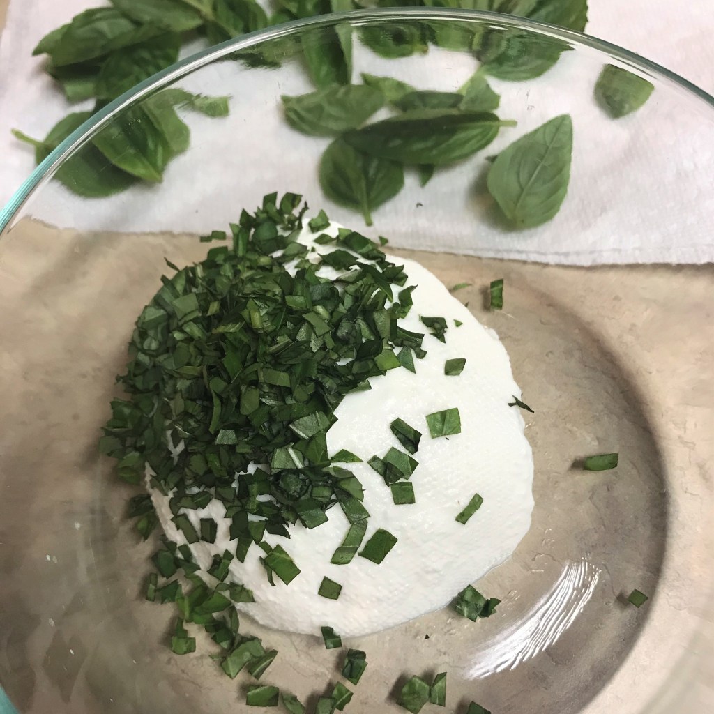 Rinse and blot dry the fresh basil leaves, then stack and chop them into small pieces. Mix the basil leaves into the strained ricotta, along with the parm-romano cheese, salt and pepper. Spoon the ricotta mixture into a small zip top bag and seal it.