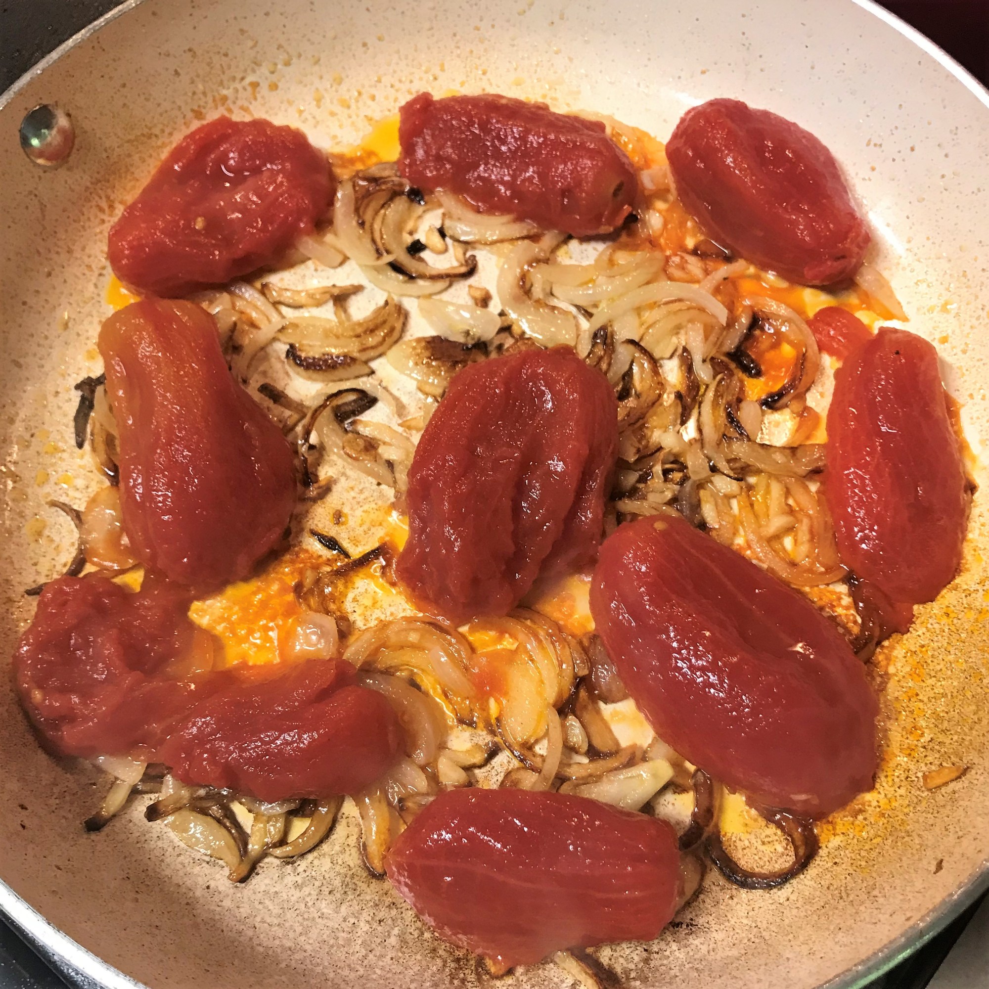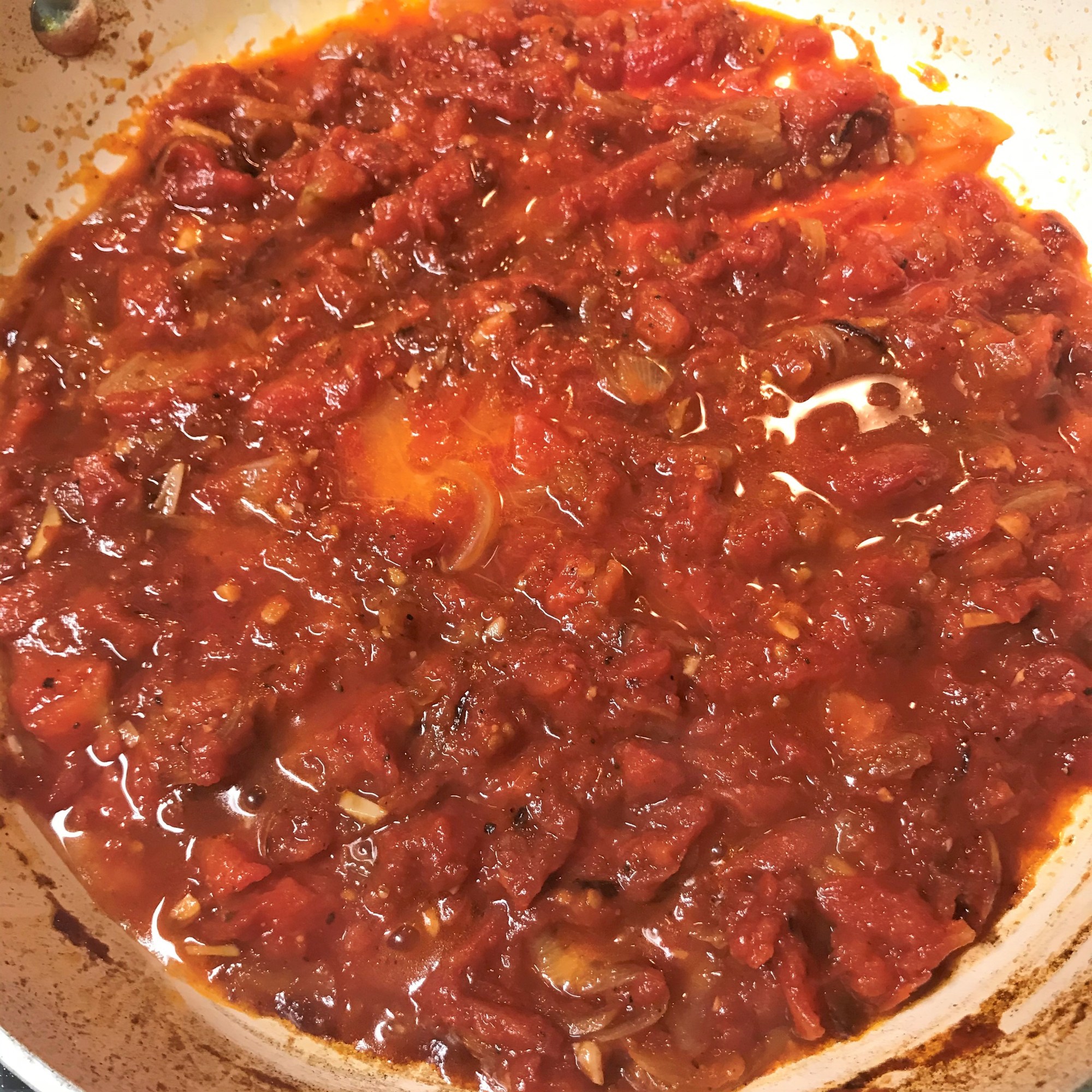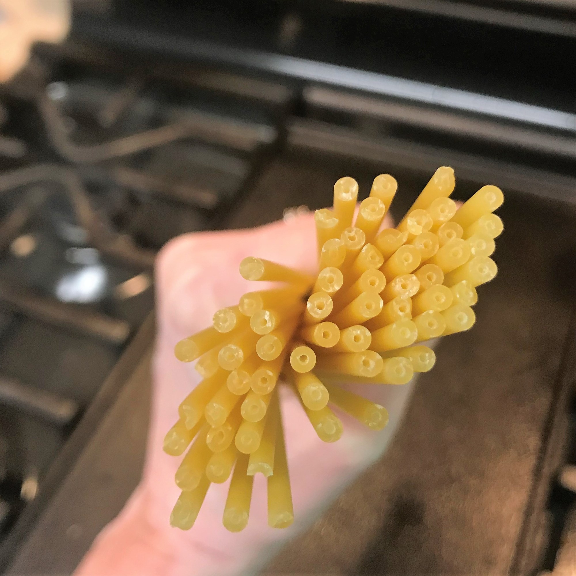 So light and crispy, and they didn’t need any kind of dipping sauce or other accoutrements. To keep our dinner easy and light that evening, I put together a simple tomato sauce (thank you, leftovers) with bucatini pasta. These three pictures describe how easy that was, and it really needs no additional explanation. Simple is good, right?
