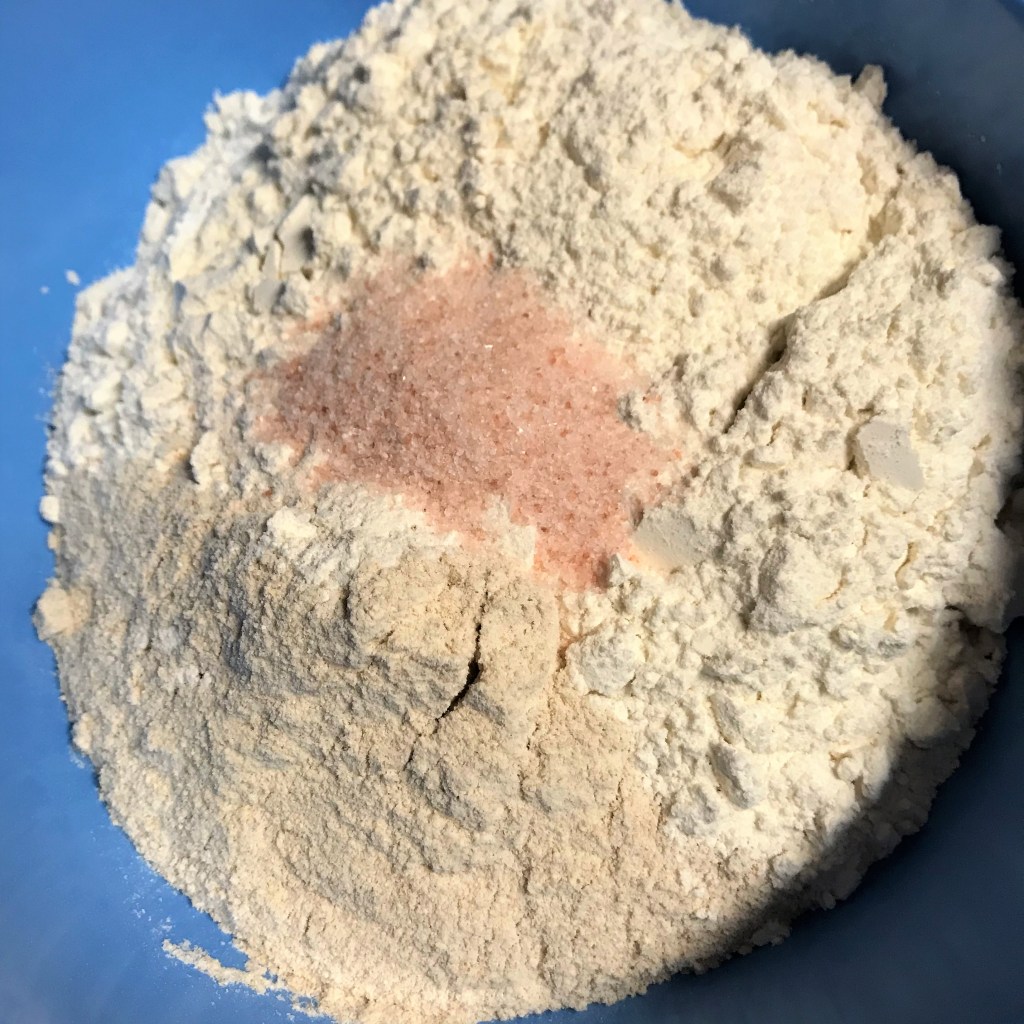 Combine the flours and salt in a bowl, then add it all at once to the starter mixture.
