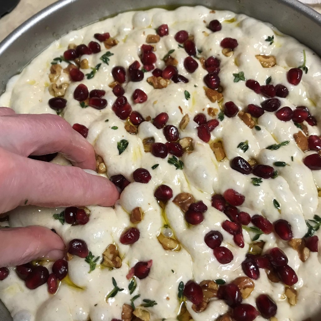 The focaccia is about 2 inches high, and you can see the pomegranate seeds and walnuts are deeply embedded into the bread.