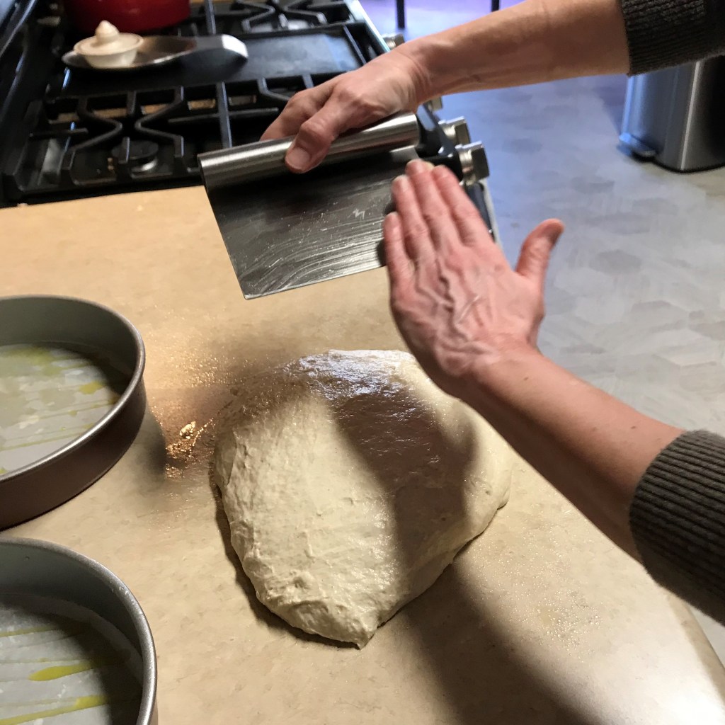 For easier dividing, use one of these tools called a bench scraper. I’m oiling mine so the dough doesn’t stick to it.