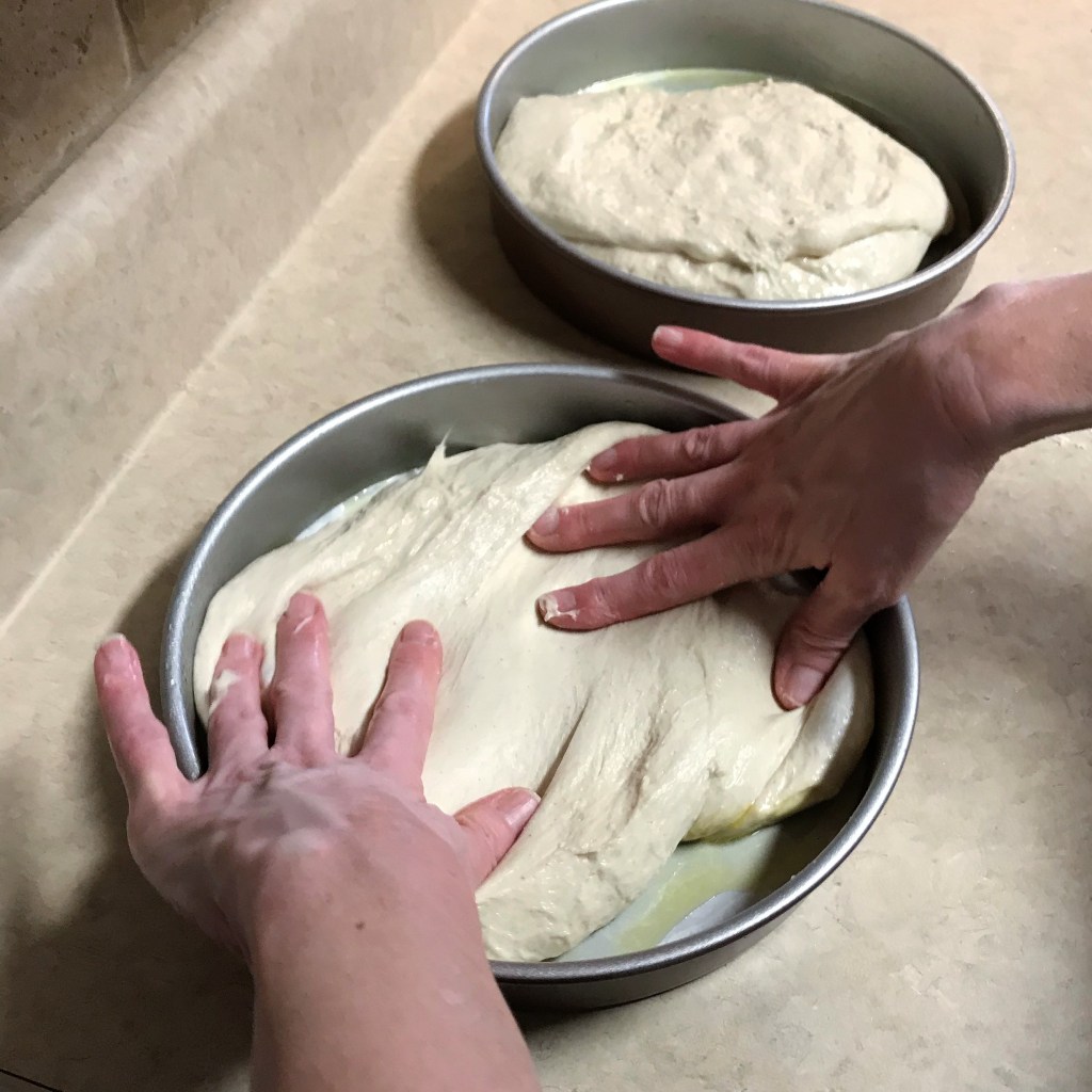I’m making two round focaccia loaves, but you could also make one large one, measuring about 9 x 13″.