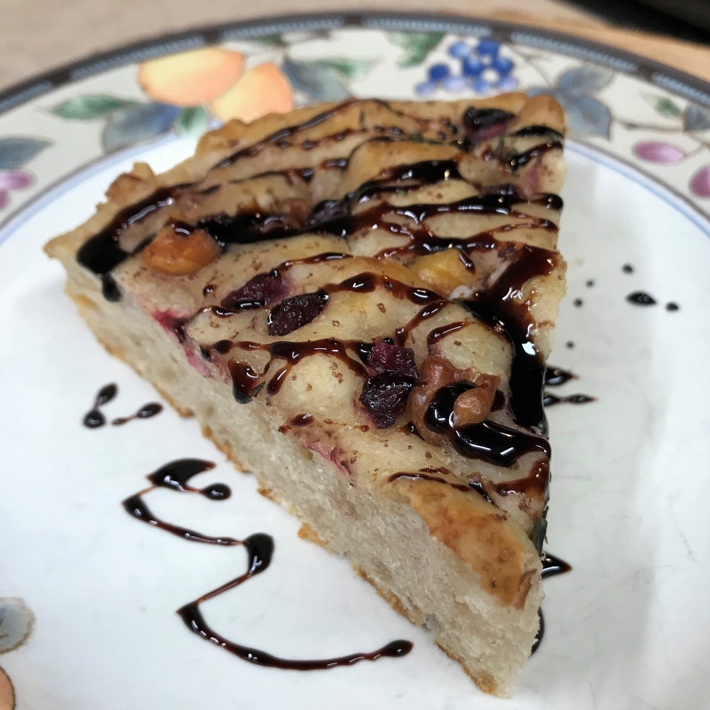 If you want to “fancy up” your focaccia, try drizzling it with a reduction of pomegranate juice and balsamic vinegar. Instructions below!