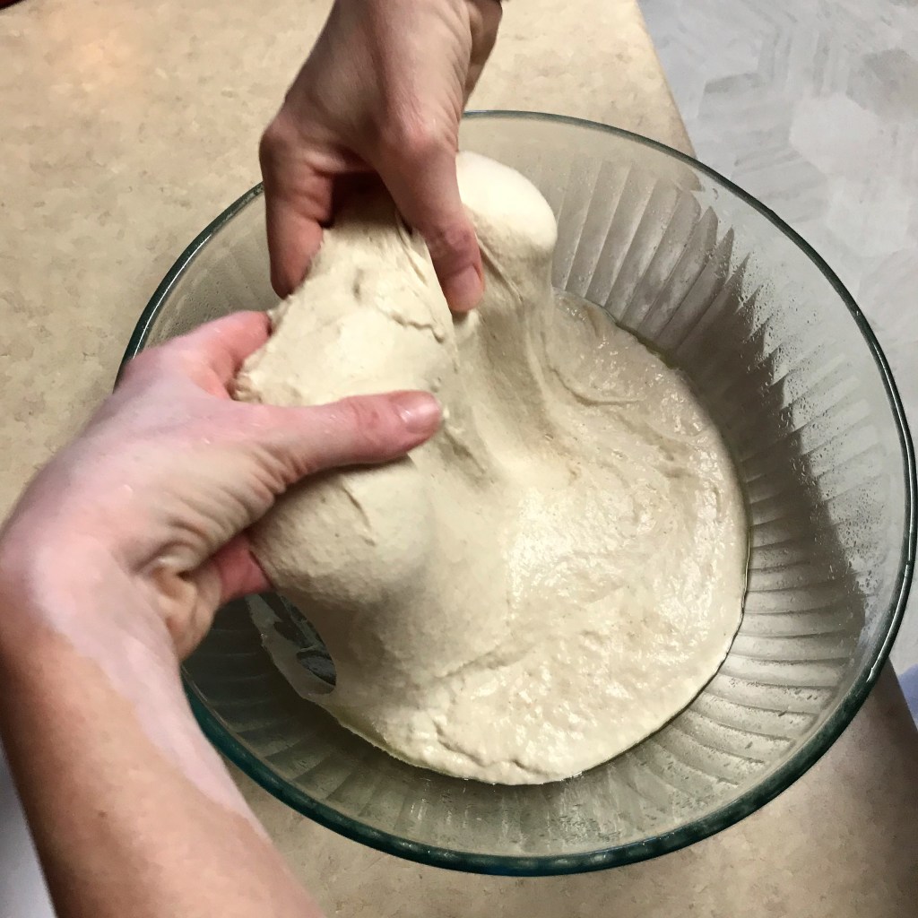 Use wet hands to grab the dough on one side. Stretch it up and over, then turn the bowl and repeat on each side for a total of four stretches.