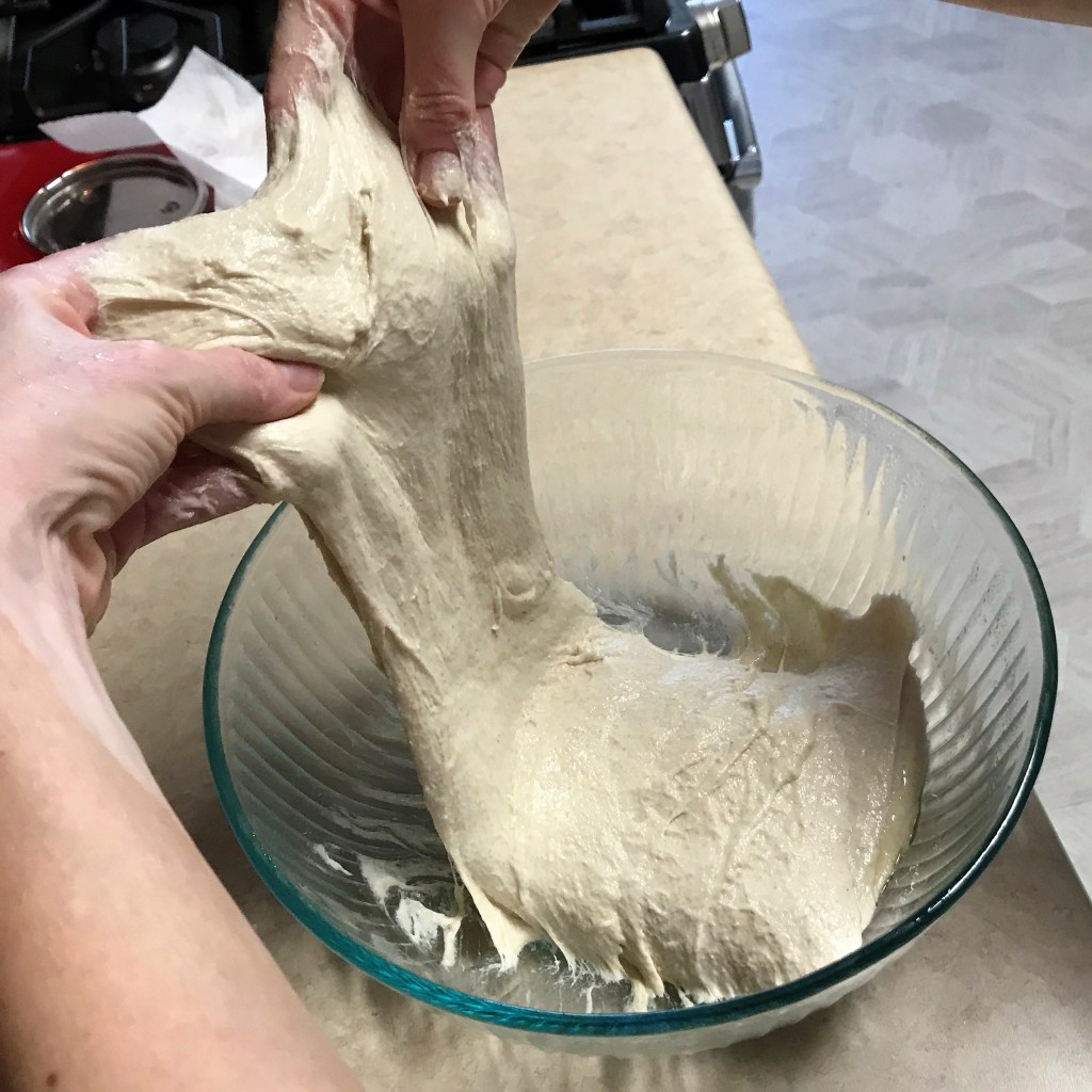 Stretching the dough at this stage feels awkward and messy, but after some time, it will gain strength and structure. Don’t worry.