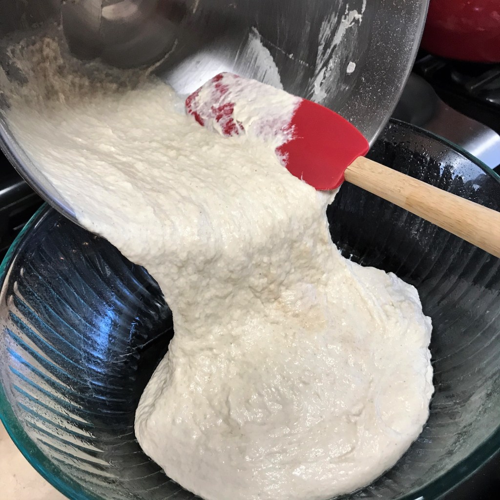 Whisk together flours and salt in a separate bowl. Add flour all at once to the starter mixture. Using the mixer’s lowest speed, beat until all flour is absorbed into the starter, which should only take 1 to 2 minutes. Increase to the next speed and beat for about 5 minutes. The dough will be wet and sticky, but gathered up around the beater blade. Remove beater blade, cover the bowl and let it rest for about 15 minutes.