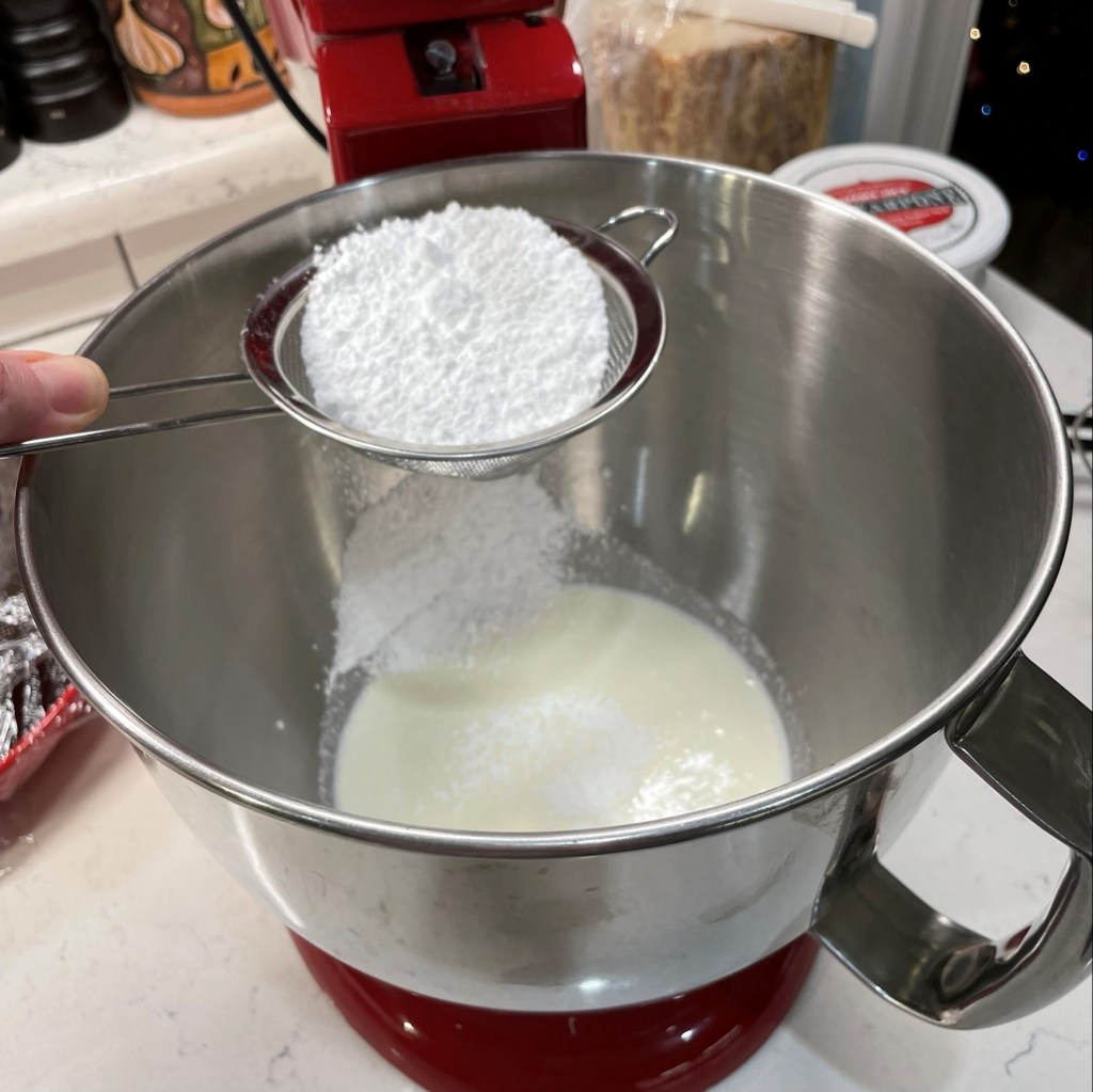 - Add half of the confectioner’s sugar and beat until incorporated, then stream in whiskey and orange bitters. Add remaining sugar a few spoonfuls at a time until you achieve desired consistency. If you overdo it, whip in a tablespoon or more heavy cream.